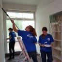 Dem Jenaer Freiwilligentag der Bürgerstiftung hatten wir es zu verdanken, dass am vergangenen Samstagmorgen neun hochmotiviere Menschen in unserer Kita auftauchten, um uns bei dringend notwendigen Renovierungsarbeiten zu unterstützen. Bis 13:30 Uhr legten sich die Freiwilligen, unter ihnen viele Studenten und Menschen mit Migrationshintergrund, mächtig ins Zeug und entfernten die Steinmauer vom Unkraut, legten Gehwegplatten vor unserem Sandsee und malerten im Bauraum, im Schalfraum, im Flur und in der Leseecke. Die Farben dafür spendete übrigens die Firma Naturaum. Zum Mittag ließen wir uns Pizza schmecken und auch mit Obst und Getränken konnten wir unsere fleißigen Helfer versorgen. Alle Freiwilligen waren total emsig und sehr zufrieden mit dem Ergebnis.