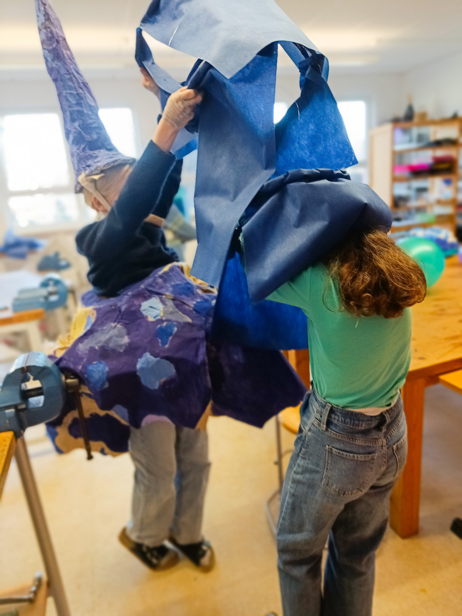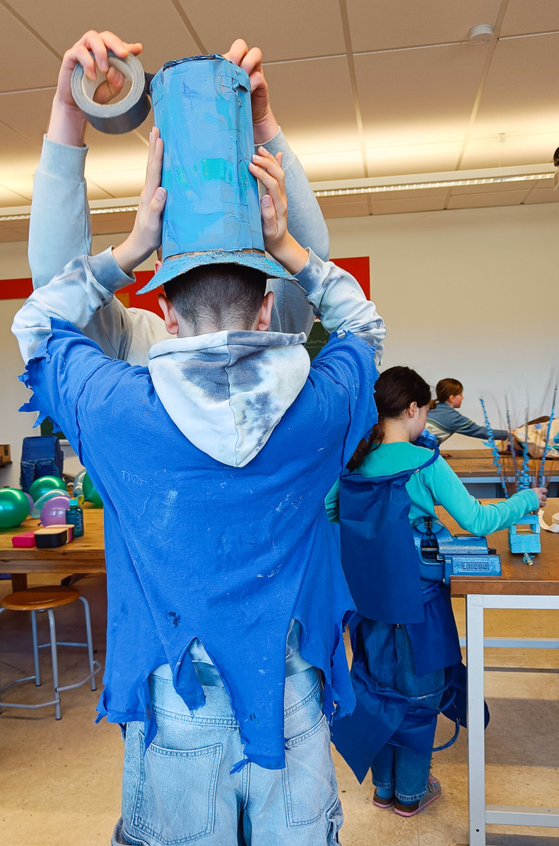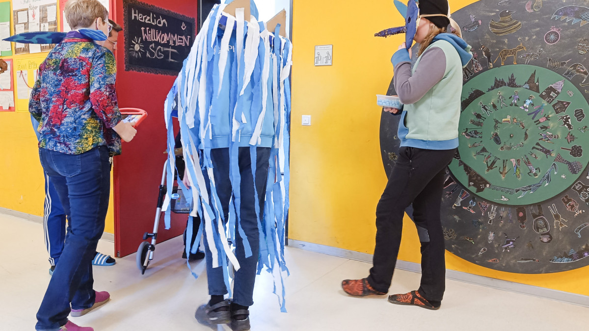 Keine Lust mehr auf Grau, her mit dem Blau! So in etwa kam die SG IV zum Thema ihres aktuellen Kunstprojekts. Denn je näher der Frühling rückte, umso größer wurde auch die Sehnsucht nach Farbe unter den Schüler*innen. Farbe haben sie schließlich im Blau des Himmels gefunden, berichtet Kunstlehrer Jonas Beetz. Also begab sich die SG IV vom 17.-21. Februar u.a. nach draußen, um die Blaufacetten des Himmels zu beobachten. Zurück im Kunstraum wurde das dann als Anlass zu Farbexperimenten genutzt. Außerdem suchten die Schüler*innen nach Sprichwörtern, Wortspielen, Geschichten und Mythen, die »Blau« zum Inhalt hatten. Inspiriert durch diese »Reisen« entstand in der Stammgruppe dann die Idee, eigene »Blauwesen« zu kreieren, die einer anderen Welt entstammen. So wurden aus Pappmaché, Stoff, Plastik, Eierpappen, Weidenruten, Federn und anderen Materialien 21 blaue Fantasiekostüme hergestellt: Reifröcke, Umhänge, Masken, Flügel, Tatzen, Hüte, Perücken und andere originelle Accessoires entstanden.