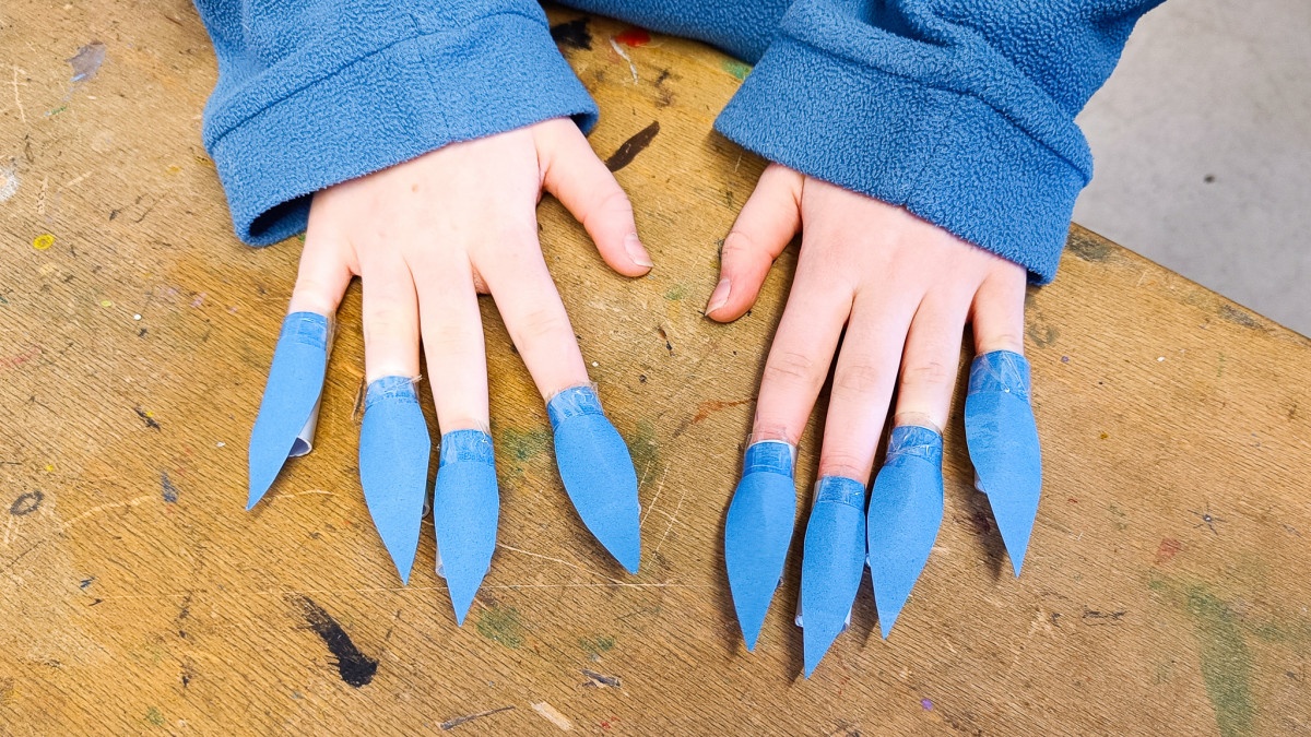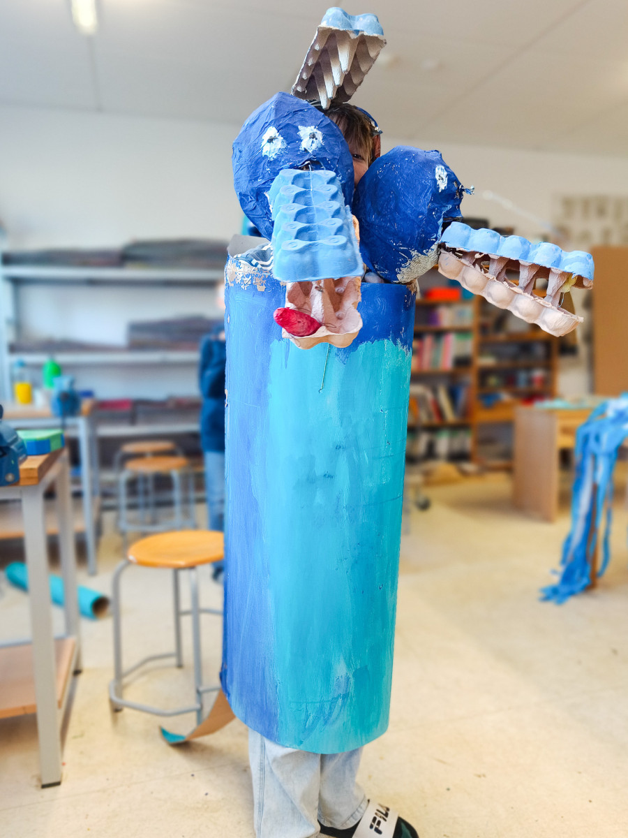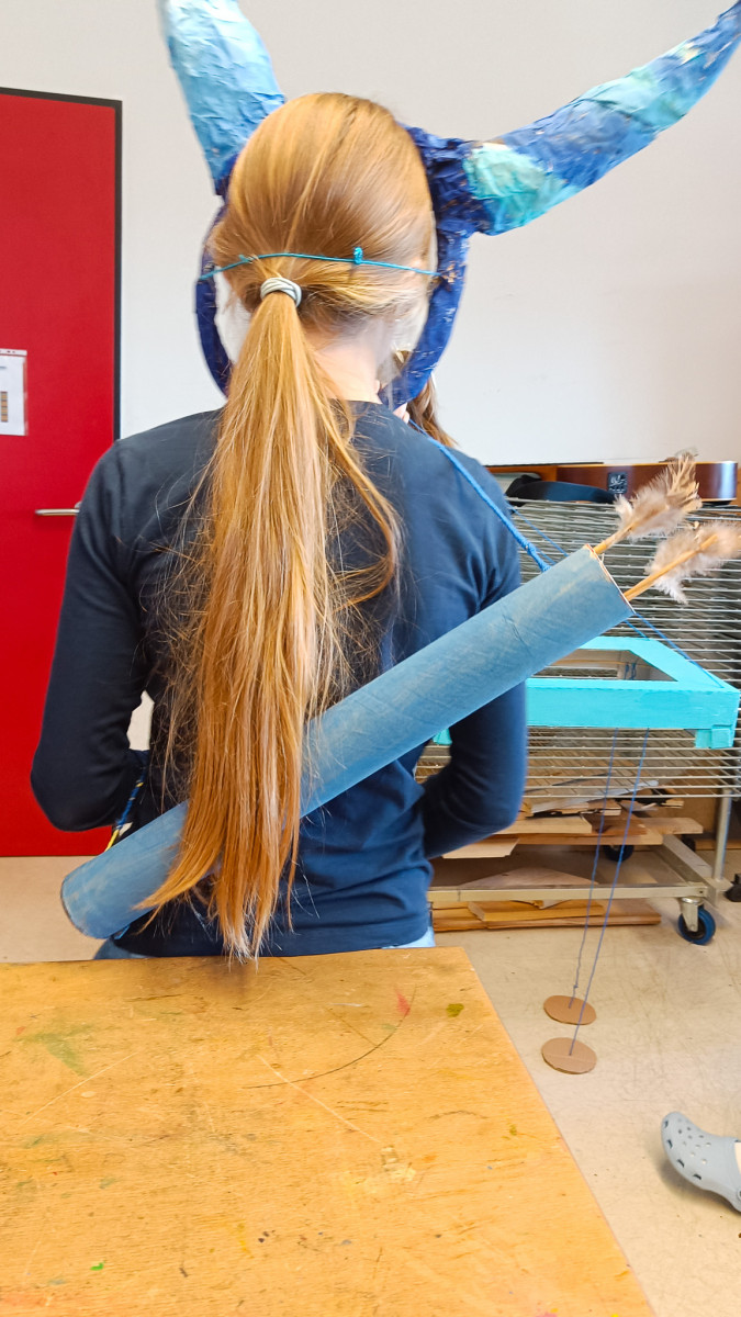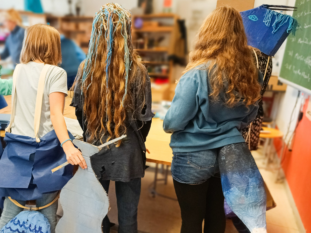 Keine Lust mehr auf Grau, her mit dem Blau! So in etwa kam die SG IV zum Thema ihres aktuellen Kunstprojekts. Denn je näher der Frühling rückte, umso größer wurde auch die Sehnsucht nach Farbe unter den Schüler*innen. Farbe haben sie schließlich im Blau des Himmels gefunden, berichtet Kunstlehrer Jonas Beetz. Also begab sich die SG IV vom 17.-21. Februar u.a. nach draußen, um die Blaufacetten des Himmels zu beobachten. Zurück im Kunstraum wurde das dann als Anlass zu Farbexperimenten genutzt. Außerdem suchten die Schüler*innen nach Sprichwörtern, Wortspielen, Geschichten und Mythen, die »Blau« zum Inhalt hatten. Inspiriert durch diese »Reisen« entstand in der Stammgruppe dann die Idee, eigene »Blauwesen« zu kreieren, die einer anderen Welt entstammen. So wurden aus Pappmaché, Stoff, Plastik, Eierpappen, Weidenruten, Federn und anderen Materialien 21 blaue Fantasiekostüme hergestellt: Reifröcke, Umhänge, Masken, Flügel, Tatzen, Hüte, Perücken und andere originelle Accessoires entstanden.