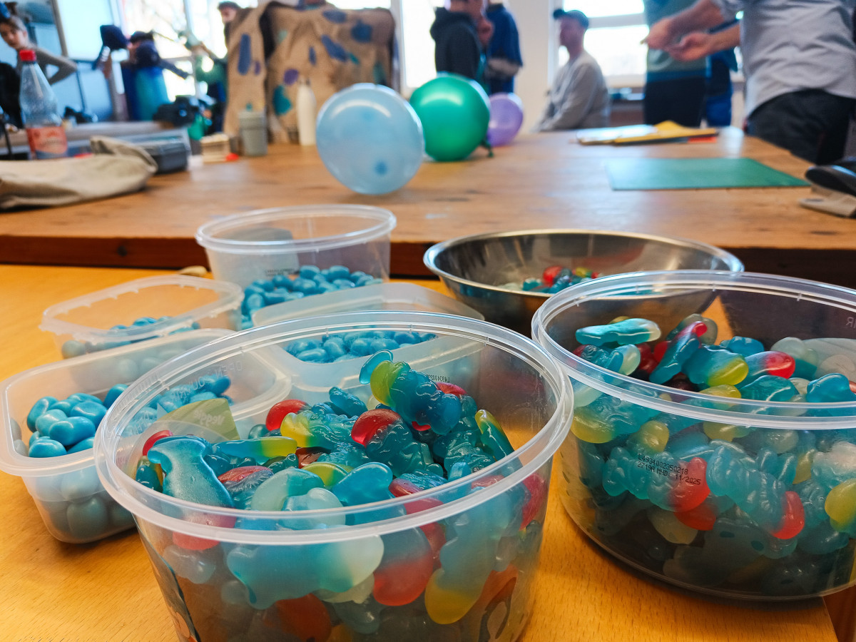 Und weil gerade Faschingszeit ist, kamen die Kostüme am Rosenmontag gleich zum Einsatz: Während der dritten Unterrichtsstunde zogen die 21 Schüler*innen der SG IV verkleidet durchs Schulhaus, störten – mit ausdrücklicher Genehmigung ihrer Pädagog*innen – den Unterricht der anderen Stammgruppen und verteilten blaue Süßigkeiten. Dazu sangen sie das mit Musiklehrer Albrecht Lätsch umgedichtete Lied »Von den bauen Bergen kommen wir«. Komplett »blau gemacht« wurde zwar nicht an der UniverSaale – aber Farbe und gute Laune haben die Blauwesen allemal verbreitet.