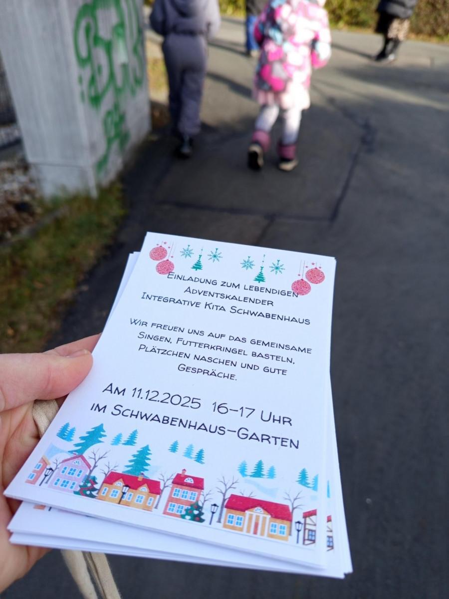In Winzerla startete die Erstauflage des »Lebendigen Adventskalenders«. An 21 Adventstagen findet jeweils eine kleine Aktion in Winzerla statt – mal ist es etwas Musikalisches, mal was zum Mitmachen oder es wird etwas Kulinarisches angeboten. Es geht darum, Einrichtungen und Initiativen in Winzerla kennenzulernen, um offene Türen, Willkommen-Sein, Sich-Begegnen und Kontakte-Knüpfen. Neben der Kita BiLLY, die schon am 2. Dezember eingeladen hatte, macht auch das Schwabenhaus bei dieser Aktion mit. Die Schwabenhäusler*innen wollen gemeinsam Futterkringel basteln, singen, Plätzchen essen und ins Gespräch kommen. Dafür haben die Kinder im Wohngebiet schon fleißig liebevoll gestaltete Einladungen verteilt und freuen sich auf viele Besucher*innen am 11.12.