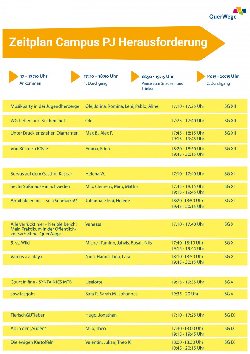 Am 25. September ab 17 Uhr präsentieren die Schüler*innen des 10. Jahrganges ihre Herausforderungen in der UniverSaale im Campus Herausforderung. In einer Pause zwischen den zwei Vortragblöcken können Eltern der 9. und 10. Jahrgänge ins Gespräch kommen. Die Schüler*innen des 9. Jahrgangs werden die Gäste in der Pause kulinarisch versorgen und so für kommende Herausforderungen Geld sammeln. Fühlt euch herzlich eingeladen.