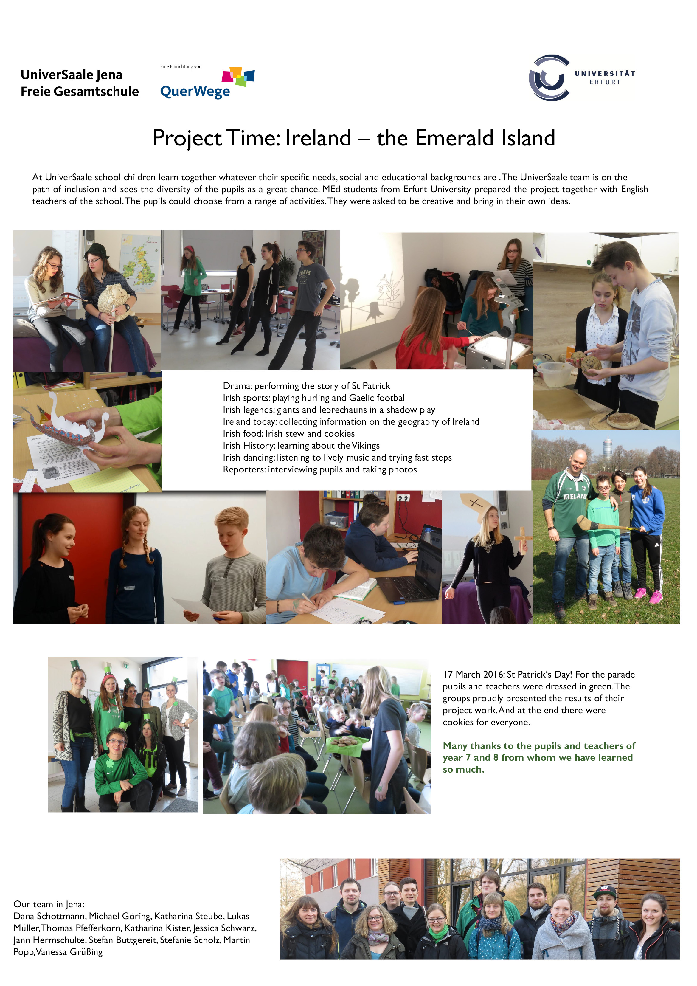 In der Woche vom 14.-17. März 2016 waren Studierende der Universität Erfurt zu Gast an der UniverSaale. Im Rahmen ihres Masterstudienganges für das Lehramt Englisch an Regel- und Förderschulen führten sie mit den Schülern und Schülerinnen der 7. und 8. Jahrgangsstufe eine Projektzeit zum Thema „Irland“ durch. Vorangegangen waren Unterrichtsbesuche und einführende Gespräche mit den Lehrkräften der UniverSaale. Ziel des Projekts war es, den Kindern vielfältige Möglichkeiten zur Beschäftigung mit dem Thema anzubieten und dabei einen Zuwachs an interkulturellen und sprachlichen Kompetenzen zu erreichen. Für die Studierenden bot sich die Möglichkeit, Einblicke in die Arbeit mit einem inklusiven Schulkonzept zu gewinnen. Sie sagen ganz herzlichen Dank an das Team der UniverSaale für die gute Zusammenarbeit!