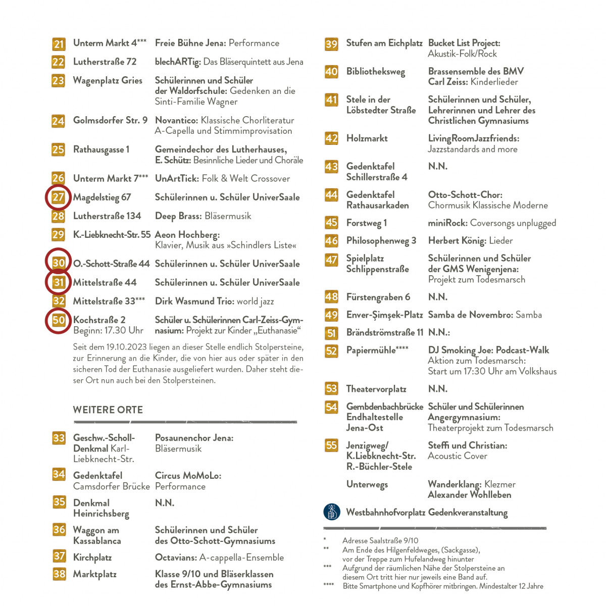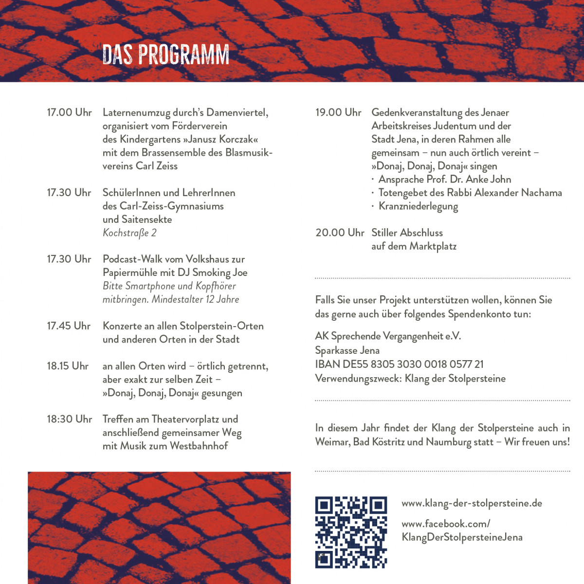 Am Donnerstag, dem 9. November, wird Jena in Erinnerung an den Schrecken der Reichsprogromnacht und den Naziterror an über 50 Stolpersteinen und Gedenkorten klingen. Hunderte Menschen setzen dem alten und neuen Nationalsozialismus musikalisch ihr »Nie wieder« entgegen. Gemeinsam mit vielen weiteren zivilgesellschaftlichen Akteur*innen und Musiker*innen beteiligen sich daran auch, wie jedes Jahr, Schüler*innen der UniverSaale mit Beiträgen und Kurzkonzerten.