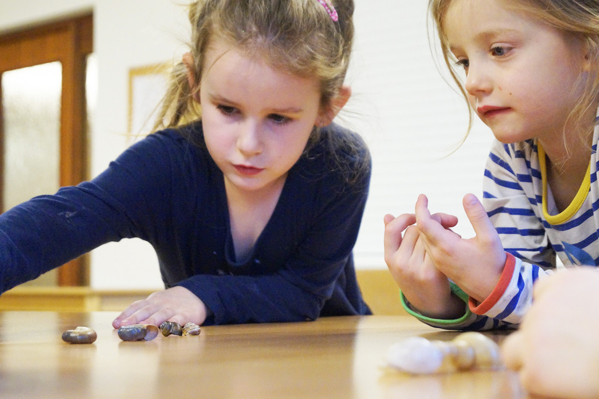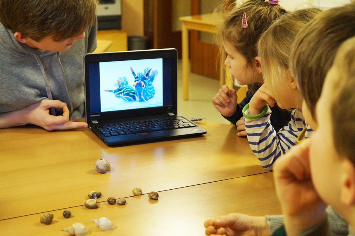 Diesmal packt er verschiedene Schneckenhäuser auf den Tisch und spielt ein kleines Memory-Spiel. Gemeinsam betrachten sie die Gehäuse, begutachten Farbe, Form und Größe. Dabei erzählt Christian, warum manche Schneckenhäuser hell und manche dunkel sind, dass sie mit den Schnecken mitwachsen und warum Schnecken eigentlich Häuser haben. Dann zeigt Christian auf seinem Laptop Fotos von ganz besonderen Schnecken. Einige sehen aus wie Schmetterlinge, andere wie Fledermäuse, wieder andere sind bunt gestreift, haben Feuerzacken oder Vulkane auf dem Körper – so scheint es zumindest. Und auch die Namen sorgen für Heiterkeit in der Runde: Posthornschnecke, Spitzhorn Sumpfschnecke, Seeschmetterling. Große Augen machen die Kinder auch, als Christian erzählt, dass Schnecken gleichzeitig Mädchen und Jungen sind. So vergeht die Zeit wie im Flug. Christian muss ab und zu an Ruhe erinnern, wenn es mit dem Geschnatter allzu wild wird, doch mit seinen spannenden Erzählungen über und seiner entspannten Art ist dem Biologiestundent die Aufmerksamkeit der Kleinen sicher. Zum Schluss möchte die Gruppe gerne Schnecken malen und so entstehen „Mausschnecken“ oder „Zweiköpfige Vulkanschnecken“ auf Papier. Nach etwa 45 Minuten ist die Zeit vorbei, die Kinder gehen mit ihren Schneckenbildern, die sie ihren Eltern zeigen wollen, zurück in ihre Gruppen.