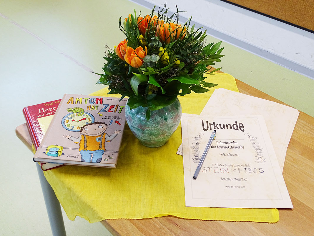 Am Standort Lobeda trugen sechs Schüler_innen (zwei waren leider erkrankt) selbst gewählte Texte vor und lasen dann im 2. Durchgang nacheinander einen unbekannten Text. Im Paradies versuchten acht Lesetalente die Jury von sich zu überzeugen. Alle Kinder hatten sich super auf diesen Wettbewerb vorbereitet, erzählten begeistert von ihrer eigenen Buchauswahl und haben auch die unbekannten Texte sehr gut gemeistert. Da fiel die Entscheidung an beiden Standorten nicht leicht. Vor dem Mittag standen die glücklichen Siegerinnen fest: Ida ist die beste Leserin im 4. Jahrgang und Eleni darf für den 3. Jahrgang beim städtischen Vorlesewettbewerb an den Start gehen. Und beide sind in der Stammgruppe der Achate! Ihre Mitschüler_innen sind dementsprechend stolz :)