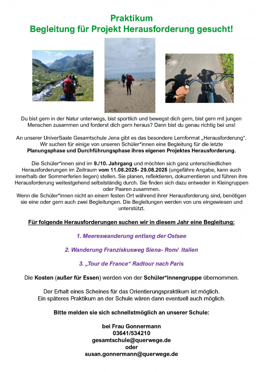 Die Schüler*innen sind im 9./10. Jahrgang und möchten sich ganz unterschiedlichen Herausforderungen im Zeitraum vom 11.08.2025 – 29.08.2025 (ungefähre Angabe, kann auch innerhalb der Sommerferien liegen) stellen. Zu zweit oder in Kleingruppen planen und führen sie ihre Herausforderung weitestgehend selbstständig durch. Bei Projekten, die nicht an einem festen Ort stattfinden, benötigen sie eine erwachsene Begleitung. Diese wird von uns eingewiesen und unterstützt. Die Kosten (außer für Essen) werden von der Schüler*innengruppe übernommen. Der Erhalt eines Scheines für das Orientierungspraktikum für Student*innen an der EAH Jena ist möglich. Studierende der FSU können einen Praktikumsnachweis erhalten.