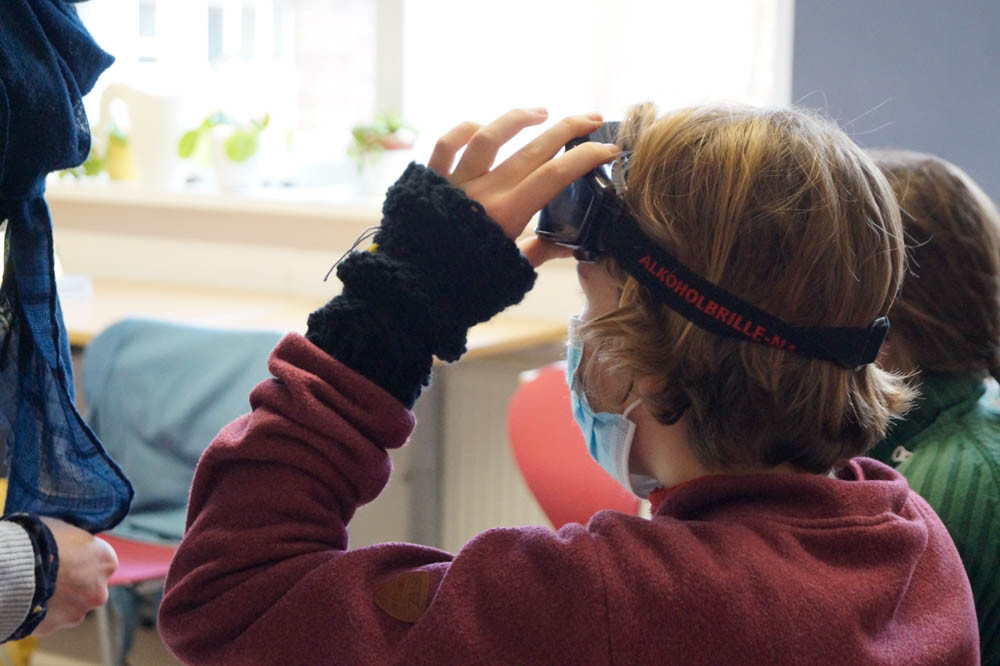 Professionelle Ergänzung der Projekttage haben sie sich auch von Dirk Höllerhage geholt, der das Projekt blu:prevent des Blauen Kreuzes koordiniert – ein Verein, der auf Aufklärung über Alkoholsucht in Schulen spezialisiert ist. Der erfahrene Referent besucht an mehreren Terminen die UniverSaale-Schüler*innen und bringt sehr anschauliche Beispiele, fesselnde Berichte und mitreißende Übungen in das Projekt mit ein. Die Alkoholbrille, kleine Experimente oder Wissensspiele verknüpfen das Gehörte mit Erlebnissen im Projekt. Aus jahrelanger Erfahrung weiß Dirk Höllerhage, dass der Umbruch gerade bei Alkoholerfahrungen der Jugendlichen zwischen der siebten und achten Klasse liegt. Sein Beitrag vermittelt zum einen Wissen über das Thema und veranschaulicht Folgen sehr bildlich. Dabei geht es weniger ums Verbieten oder Verteufeln, vielmehr um Stärkung und Enttabuisieren. „Behaltet immer die Kontrolle“ gibt Dirk Höllerhage den Jugendlichen am Ende mit auf den Weg.