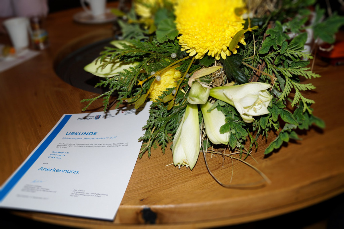 Bad Köstritz, den 04.12.2017. Der Behindertenbeauftragte der Thüringer Landesregierung, Joachim Leibinger, hat gemeinsam mit Arbeitsministerin Heike Werner und dem Chef der Bundesagentur für Arbeit Regionaldirektion Thüringen, Kay Senius, die Preisträger des Inklusionspreises „Bewusst anders?!“ ausgezeichnet. Bewertet wurden von der Jury aus dem Thüringer Arbeitsministerium gemeinsam mit der Handwerkskammer für Ostthüringen und der IHK Ostthüringen zu Gera, ob die vorgeschlagenen Unternehmen spezielle Arbeitsbereiche für behinderte Mitarbeiter schaffen, ob Azubis mit Behinderung übernommen werden oder ältere behinderte Mitarbeiter im Unternehmen gehalten werden. QuerWege war nominiert. Der mit 3.000 Euro dotierte Preis ging zu gleichen Teilen an die Porzellanfabrik Hermsdorf GmbH und die Interdisziplinäre Praxis Tom Wildensee. Beide Unternehmen sind mittelständisch geprägt und übererfüllen ihre Beschäftigungsquote (Anteil von schwerbehinderten Menschen ca. zehn Prozent).