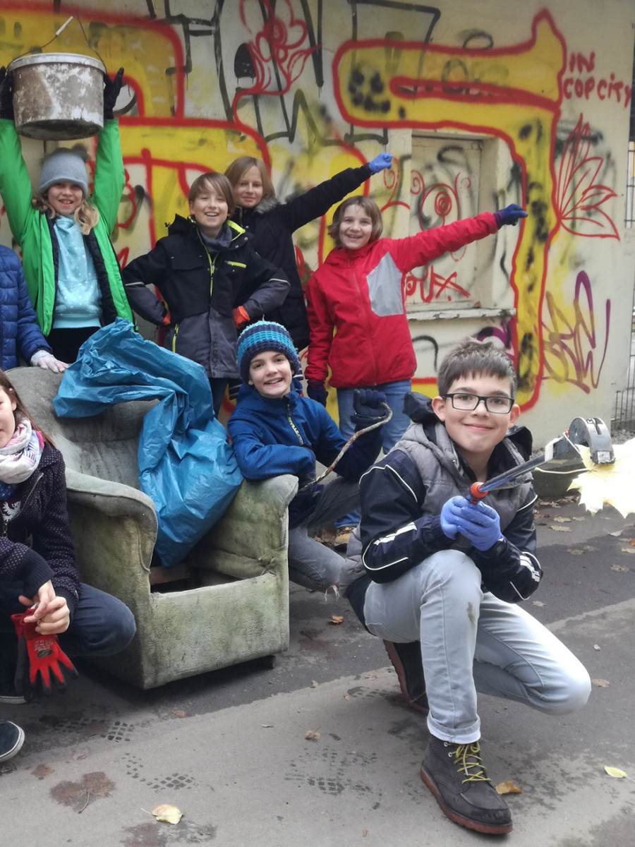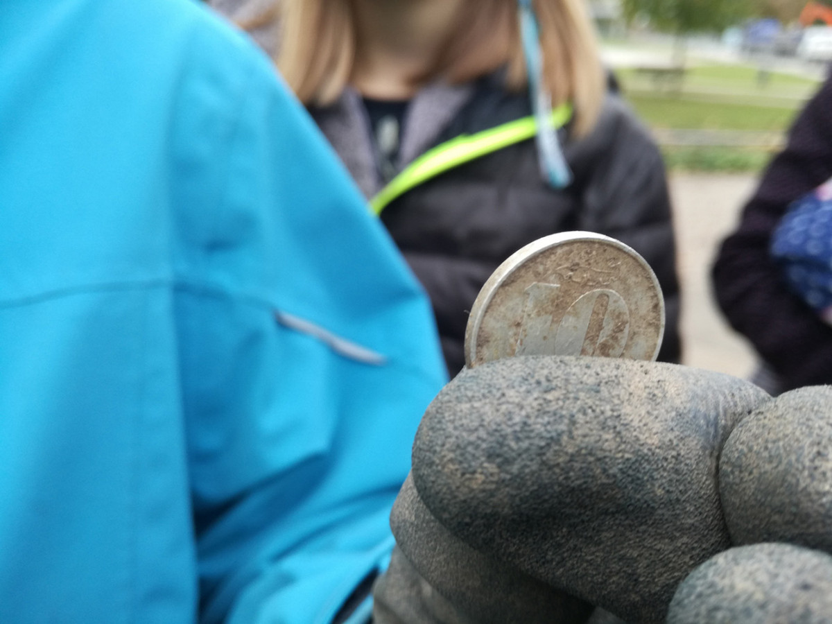 Zudem schulten die 5– und 6–Klässer*innen ihre Artenkenntnis vor Ort und gingen auf Exkursion ins Paradies. Sie entdeckten z.B. einen Graureiher in der Saale und verschiedene Fledermaus-Kästen. Bei diesem Rundgang durch den Park fiel den Schüler*innen die Verschmutzung des Saaleufers und des Teiches negativ ins Auge. Spontan entstand die Idee, Müll einzusammeln und so die Gefahren durch Glasscherben, Plastikflaschen, Tüten etc. für Tiere und Menschen zu reduzieren. In weniger als einer Stunde hatten die rund 20 Schüler*innen, ausgestattet mit Handschuhen und Greifern, zwei volle Müllsäcke zusammen. Sie waren erschrockiert darüber, wie viele Scherben von einer zerbrochenen Bierflasche in die Umwelt gelangen und dass Menschen sogar alte Sessel in die Natur schmeißen. Das Fundstück des Tages war übrigens ein 10–Pfennig-Stück aus DDR-Zeiten.