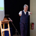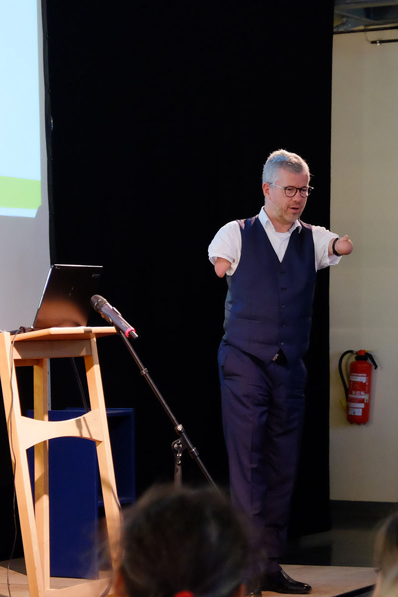 Nach einer Begrüßung durch Anke Protze und Tasso Carl ließen wir uns von dem äußerst unterhaltsamen und motivierenden Rainer Schmidt anstecken, der – fast hätte man es vergessen – ohne Hände geboren wurde. Dass er „nicht Klavierspielen, Schnürsenkel binden oder sich mit der linken Hand am rechten Ohr kratzen kann“ schmälert seine Energie und optimistische Grundhaltung zum Leben in keinster Weise. Sein Humor und distanzlose Herangehensweise an das Thema Anders-sein war ansteckend. Er brachte uns seine Sicht von einem selbstverständlichen Miteinander verschiedenster Menschen, die nicht gleichartig aber alle gleichwertig sein müssen, näher und machte Mut und Lust auf die Herausforderungen in der eigenen Arbeit. Sein Vortrag wiederholte zwar für die meisten unter uns Bekanntes (Kinder müssen sich selbst herausfordern und nach dem eigenen Tempo beim Lernen suchen) setzte aber immer wieder auch Impulse zum Nachdenken (Förderbedarf hat jeder, gerecht wäre eine Förderung für alle) und sprach Paradoxes im Bildungssystem an (Diagnose-Ressource-Dilemma). Nicht zuletzt ist er mit seiner Person das beste Beispiel dafür, dass man erst anerkennen sollte, was ein Mensch alles kann und weniger wichtig ist, was ihm fehlt. Für ihn ist Inklusion deshalb schlicht Dazugehörigkeit, die Grenzen abbaut.