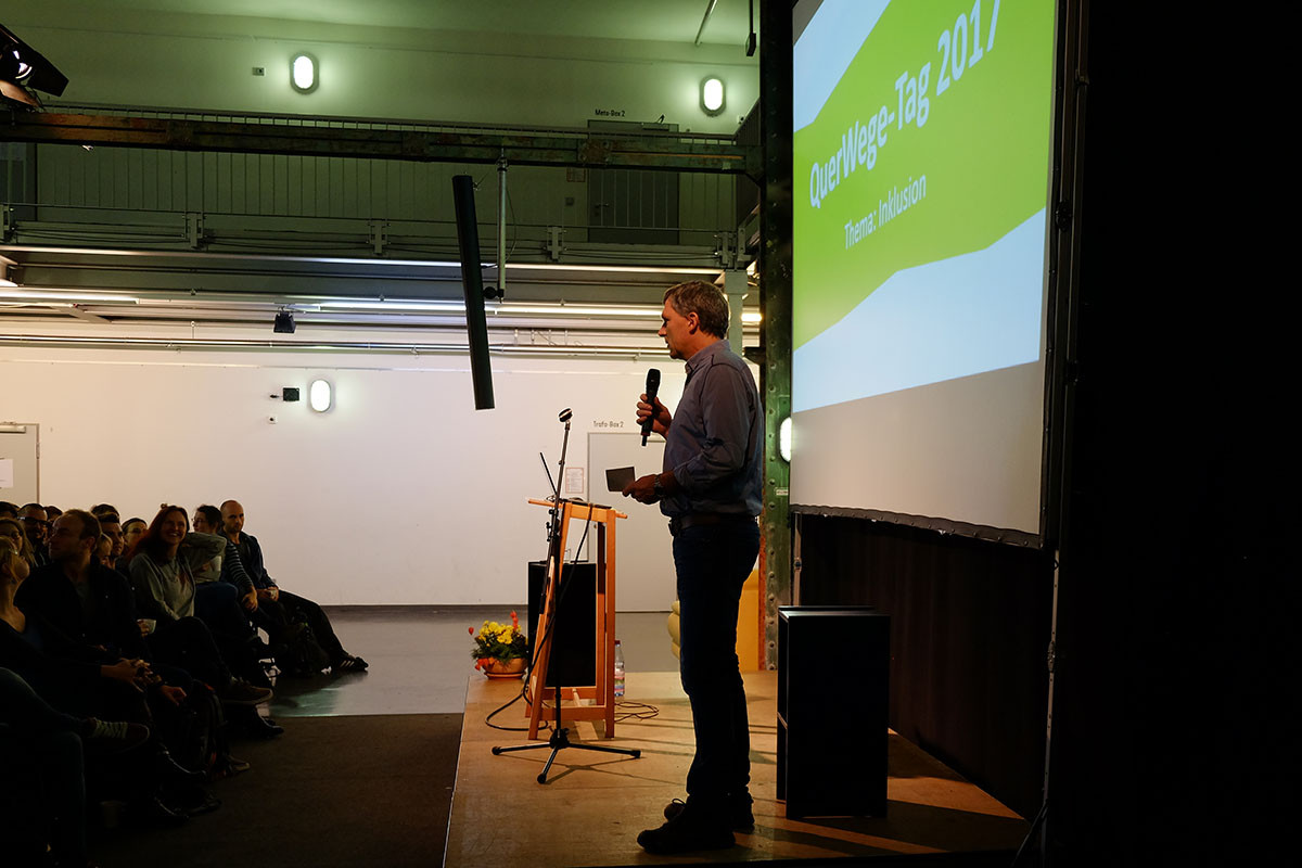 Der erste QuerWege-Tag widmete sich unserem Leib-und-Magen-Thema: Inklusion. Dafür waren Rainer Schmidt, seines Zeichen ehemaliger Leistungssportler, Referent, Pfarrer, Sportler und Kabarettist eingeladen sowie Ines Boban und Prof. Dr. Andreas Hinz – beide Sonderpädagogen, Wissenschaftler und Inklusions-Experten. Damit alle Mitarbeiter_innen dabei sein konnten, hatten wir zum ersten Mal die Uhren in den Einrichtungen still gestellt und einen Schließtag eingeführt. Die Imaginata, Industriedenkmal mit Charme, bot für unsere Veranstaltung den passenden Rahmen und Platz für die rund 230 QuerWegler_innen, die kamen.