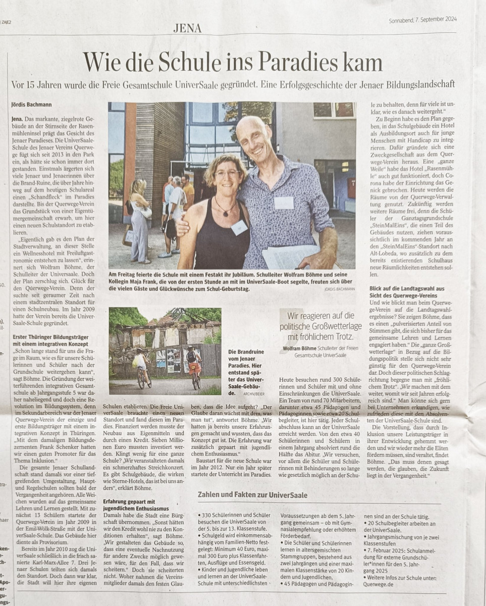 Das große Schulfest anlässlich unseres 15–jährigen UniverSaale-Jubiläums am 6. September war ein üppiges, dichtes und emotionales Highlight unseres noch jungen Schuljahres.