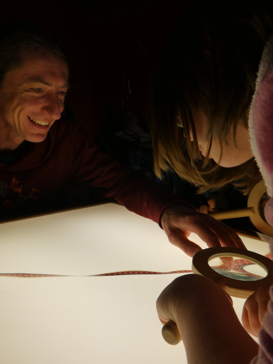 Popcorn, Dunkelheit und einen Film… Kino im BiLLY gab es ja schon öfter, aber was ist ein Projektor? Wo kommt ein Film her? …und da sind doch nur einzelne Bilder? Alles über Filme und wie es sein kann, dass Bilder beginnen sich zu bewegen haben wir gemeinsam von Nils und seinem mobilen Kinderkino “MoKiKi” gelernt. Sogar einen eigenen Film für die sogenannte Schlitztrommel haben wir zusammen gebastelt. Somit haben wir, an zwei Tagen, ganz viel über Filmrollen, Projektoren oder Lichtquellen gelernt. Auch Popcorn wird es zur nächsten Vorstellung wieder geben.