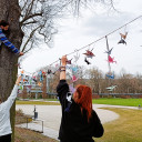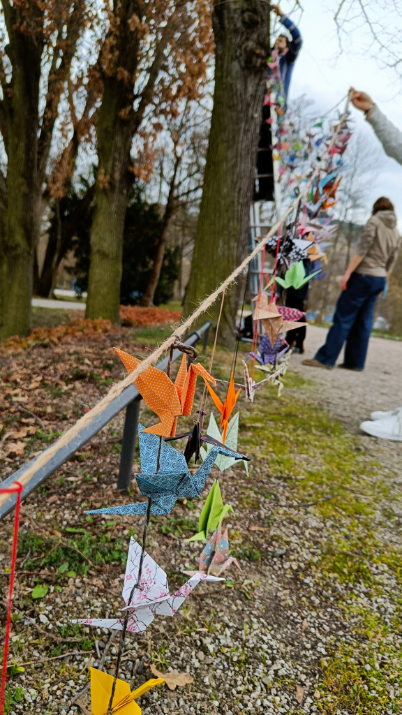 Die Leiterin der Kreisdiakoniestelle Jena, Isa Schmiedgen, hat sich diese wahre Geschichte zum Anlass genommen, um für das Jahr 2024 in Jena ebenfalls 1000 Kraniche fliegen zu lassen, als Zeichen für ein friedliches Miteinander in einer konfliktbeladenen und krisenerschütterten Welt. »Die Idee, Origami-Kraniche mit aktuellen gesamtgesellschaftlichen Themen zu verbinden, entstand, weil der Diskurs zwischen unterschiedlichen Vorstellungen von politischem Handeln zunehmend von Aggression, Unverständnis und verbaler Gewalt dominiert wird. Nicht nur auf Social Media-Kanälen. Meine Grundannahme ist jedoch, dass sich die meisten Menschen wünschen, in einer friedlichen Gesellschaft zu leben, aber auch eine gewisse Hilflosigkeit herrscht, wie wieder wirkliche, respektvolle Kommunikation möglich ist«, so Isa Schmiedgen. Das Falten von Kranichen ist also eine kleine Tat, bei der jeder einzelne wirksam werden kann.