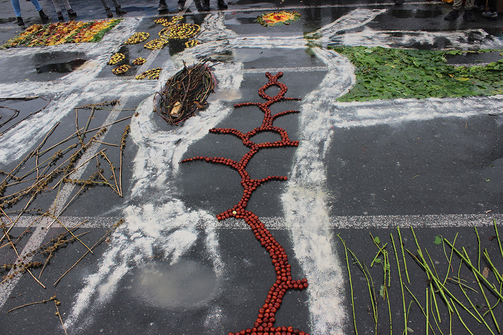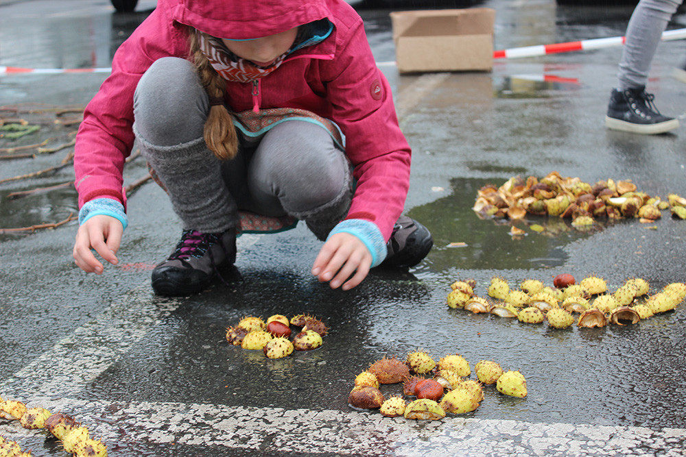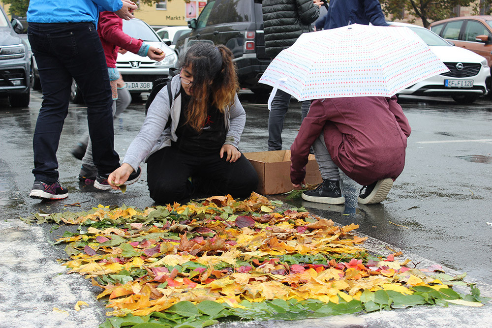 Einstieg bot am 5.10. ein Film über den Landart-Künstler Andy Goldsworthy. Am Dienstag ging es für die 20 Schüler*innen in die Natur. Im Wald bei Ammerbach wurden Naturmaterialien gesucht und daraus in Kleingruppen Objekte gebaut. Zwischendurch gab es Übungen zur Stille. Die Objekte wurden fotografiert und zurück in der Schule verfremdet auf Plexiglas übertragen. Diese und ähnliche Vorübungen mündeten am Freitag in einer Kunstaktion auf dem Jenaer Eichplatz. Der Ort wurde nicht zufällig gewählt, schließlich gibt es seit Jahrzehnten Diskussionen über den Neubau dieser Beton-Park-Brachfläche und nicht wenige Bürger*innen wünschen sich eine Begrünung des zentralen Platzes. Der Regen an diesem Vormittag hielt die motivierte Stammgruppe nicht davon ab, ihren Plan – durch Kunst ein Zeichen zu setzen – durchzuführen. Mit Regensachen und Schirmen ausgestattet ordneten sie Blätter, Holz, Zweige, Kastanien und nutzen Gips zur Gestaltung. Der Prozess ging mit sehr viel Ruhe einher (die einzelnen Gruppen hatten sich vorher Gedanken zu ihren Teilstücken gemacht und die Materialien im Paradiespark zusammen gesucht) – musikalisch unterlegt durch den Klang der Regentropfen. Die Schüler*innen schufen ein organisches Gebilde inmitten parkender Autos, das sogar einige Passanten zum Innehalten und Nachfragen anregte.