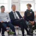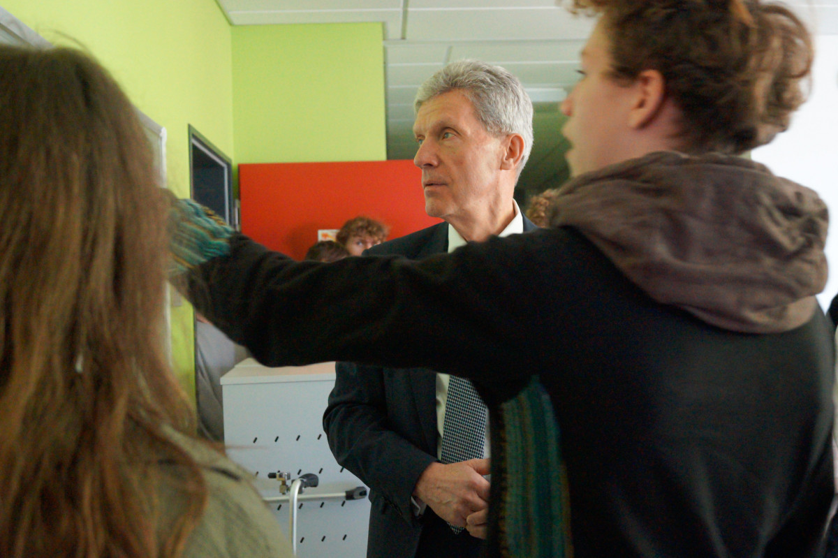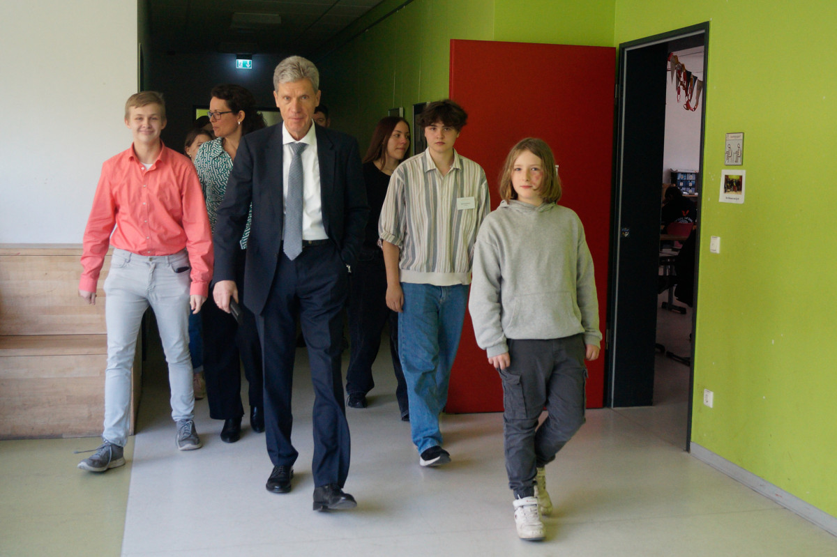 Herr Holter nutzte bei seinem Besuch auch die Gelegenheit, mit Schüler*innen direkt ins Gespräch zu kommen und erfuhr, was sie an unserer Schule besonders schätzen: Das Miteinander, die Möglichkeit, sich einzubringen, die Toleranz untereinander wurde genannt. »Alle können hier mitlösen« erzählte z.B. Michel.