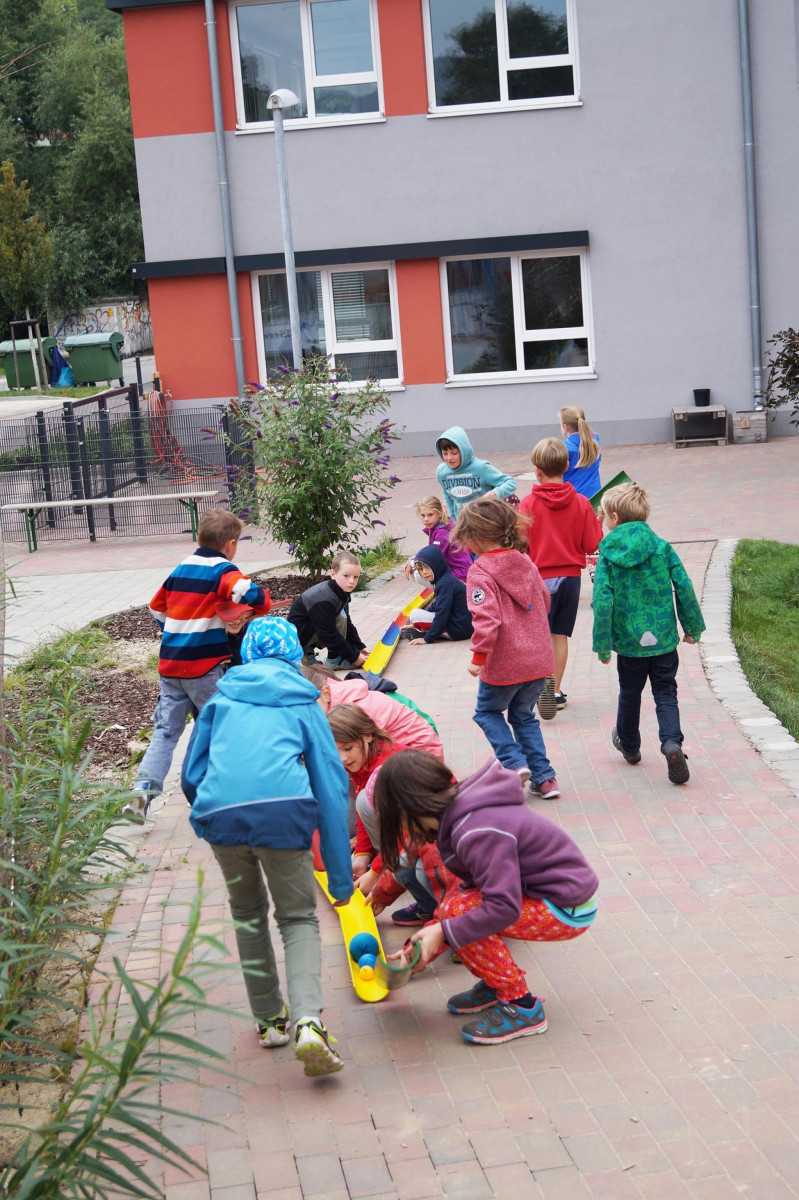 „Pass auf, da kommt er!“ „Lege deine Rinne an!“ „Ich krieg ihn nicht mehr!“ Und schon schnippt der kleine Ball aus der Regenrinne und hüpft auf den Boden. Mio, Feline, Martin und die anderen Kinder der Feuersteine-Stammgruppe spielen das Regenrinnen-Spiel, bei dem alle eine unterschiedlich lange Rinne in der Hand halten und diese so miteinander verbinden sollen, dass drei Kugeln darin über eine längere Strecke bis ins Ziel laufen können. Geschicklichkeit und Zusammenarbeit sind gefragt und schon nach kurzer Zeit läuft es immer besser und die Kugel schnurrt immer schneller und weiter durch die Rinne.