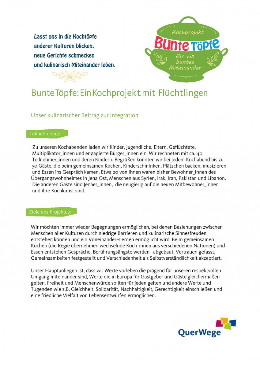 QuerWege e.V. Kochprojekt: „ Bunte Töpfe“ Deutsche Kreditbank IBAN: DE 96120300001005364508 BIC BYLADEM 1001