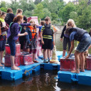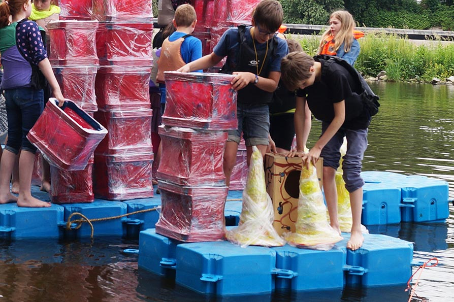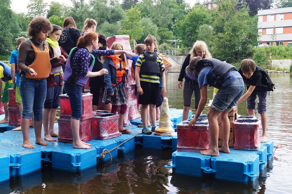 Seit Montag bereiten die Schüler_innen der SG 4 (5. und 6. Jahrgang) eine Licht-Klang-Performance vor, die sich künstlerisch mit dem Thema Migration beschäftigt. Bereits zum zweiten Mal haben sie heute auf einer schwimmenden Plattform auf der Saale geprobt. Die Schüler haben in der Klangfarben-Projektwoche eine Performance kreiert, welche mit Klängen, Formen und Farben spielt und Bezug nimmt auf aktuelle Fragen: Wieviele Menschen können wir aufnehmen? Was passiert, wenn “Fremde” zu uns kommen? Wie kann Integration gelingen? Sie haben sich dafür mit der aktuellen Debatte, Schlagzeilen und Texten beschäftigt und Schlagworte, Metaphern und Phrasen hinterfragt und kreativ aufgearbeitet. In den letzten Tagen sind außerdem Bauelemente und Requisiten entstanden sowie filigrane Friedenstauben. Genannt haben sie ihr Stück “Der Mensch lebt nicht vom Boot allein”. Der biblische Bezug ist kein Zufall und findet sich während der Performance noch an anderen Stellen wieder. Und auch die Kunstform des Triadischen Balletts – die auf den Bauhaus-Künstler Oskar Schlemmer zurückgeht – stand Pate für die Ausgestaltung des Projekts. So ist ein Mix aus Licht, Rhythmus, Requisiten und Gedankenspielen entstanden, der bei Sonnenuntergang erst richtig zur Geltung kommen wird.