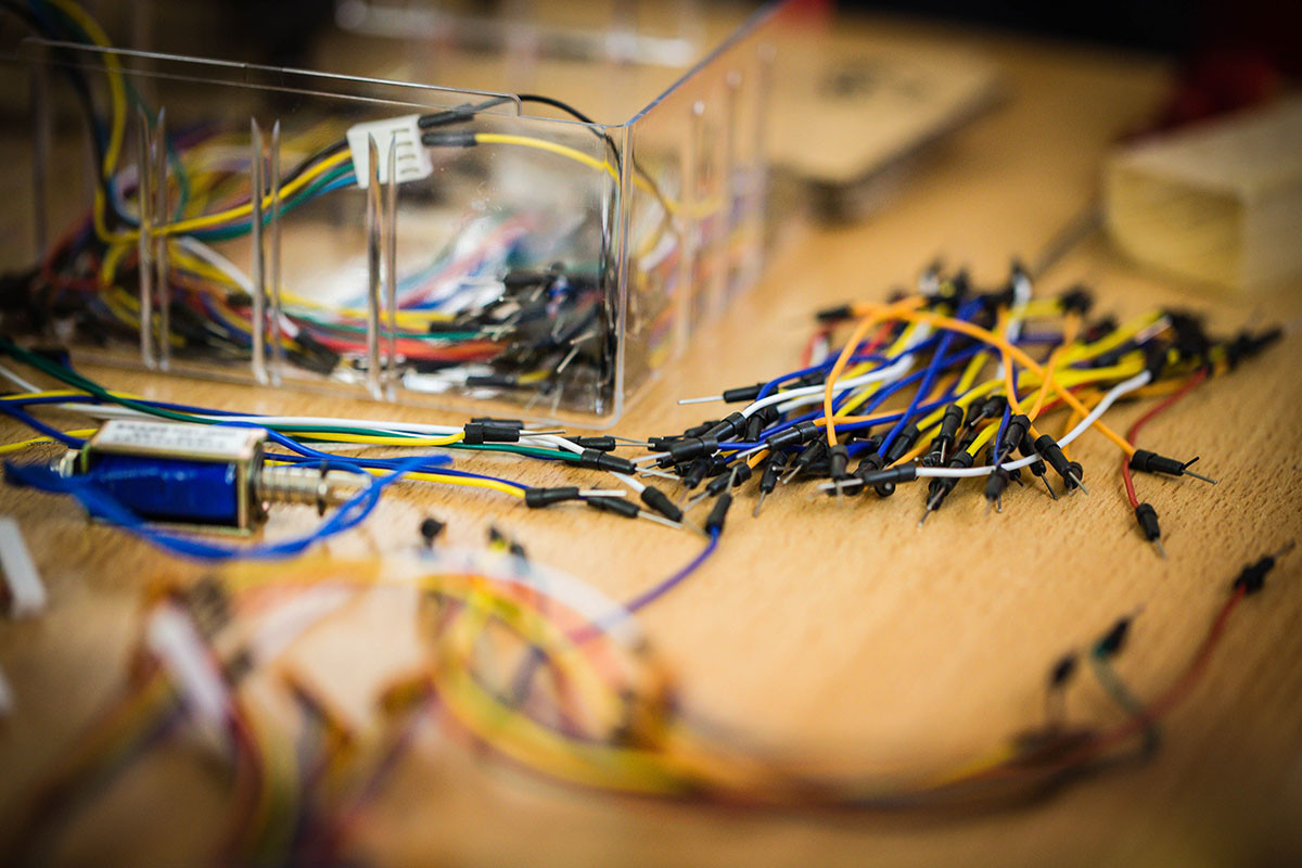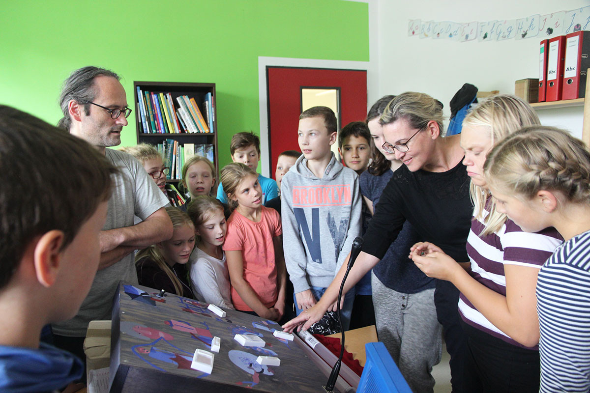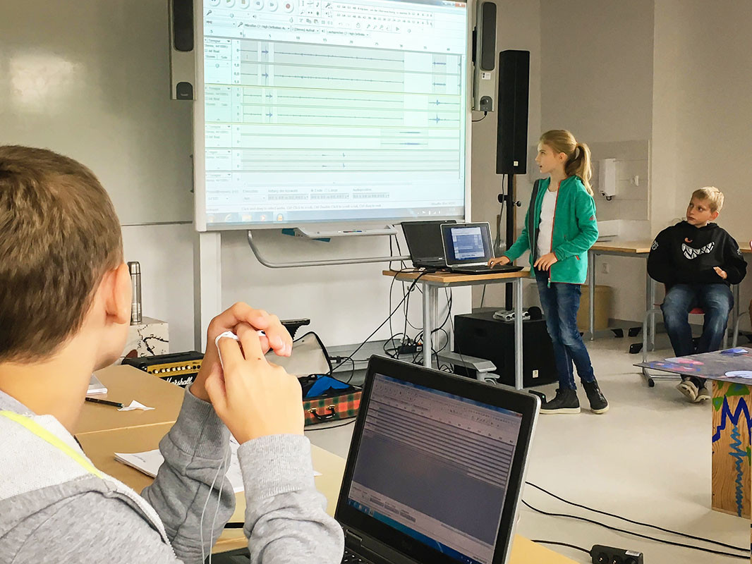 In der Projektwoche, die vom 11.-15. September 2017 stattfand, stand die künstlerische Auseinandersetzung mit Klängen, Geräuschen und Texten im Mittelpunkt. Die Schüler_innen arbeiteten dafür an verschiedenen Aufgaben: Sie konzipierten, bauten und gestalteten die Steuerzentrale in Abstimmung mit dem Sekretariat, kümmerten sich um die Klang-Text-Kompositionen, suchten zu den Ansagetexten die entsprechenden Klänge und erstellten die Sprach-, Musik- und Klangaufnahmen. Auch das Innenleben musste mittels einer Steuersoftware, die auf Knopfdruck zum hörbaren Klang führt, entworfen werden.