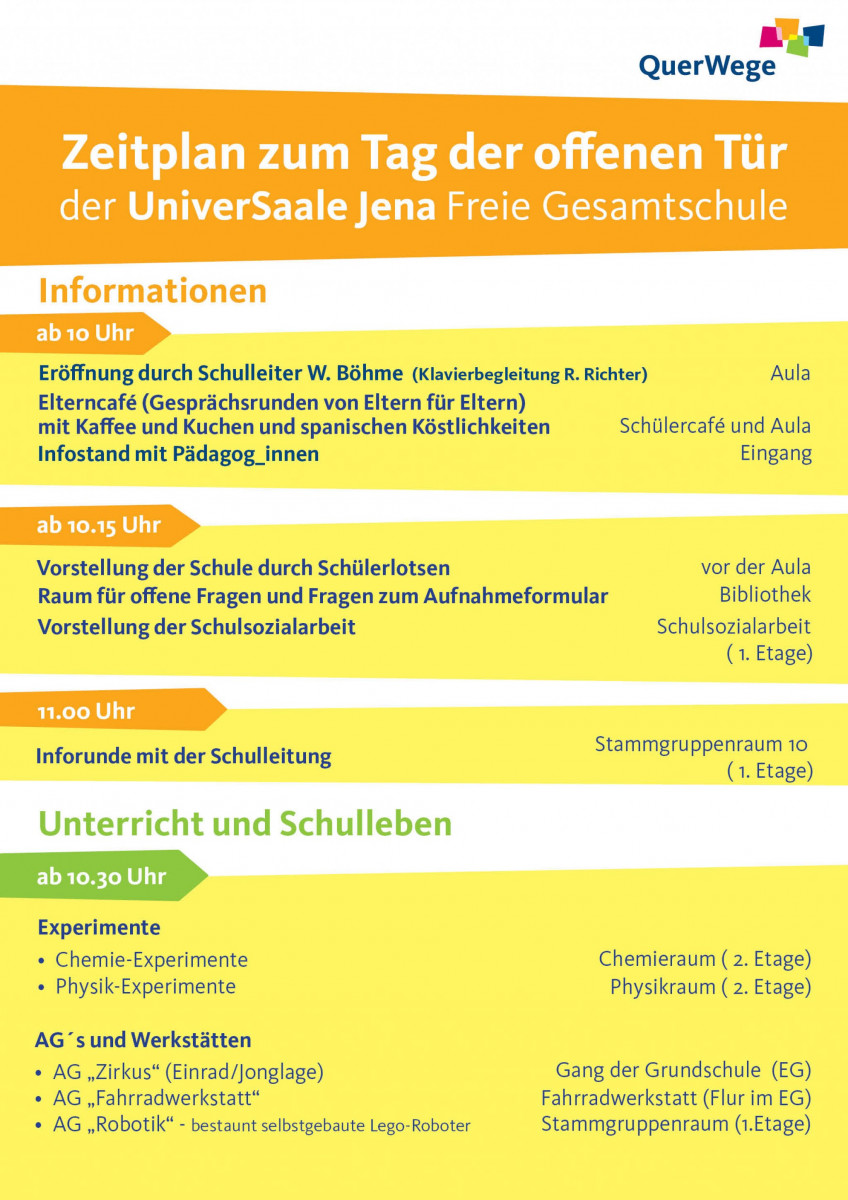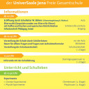 Die UniverSaale Jena Freie Gesamtschule lädt am Samstag, dem 5. November alle Interessierten zum Tag der offenen Tür ein. Der Infotag eignet sich besonders für Viertklässler und deren Eltern, die noch auf der Suche nach einer weiterführenden Schule sind. Zwischen 10 und 13 Uhr können Kinder und Eltern mit den Pädagogen sprechen und das reformpädagogisch orientierte Schulkonzept kennenlernen. Alle Schulabschlüsse, inklusive Abitur, können an der Ganztagsschule absolviert werden.