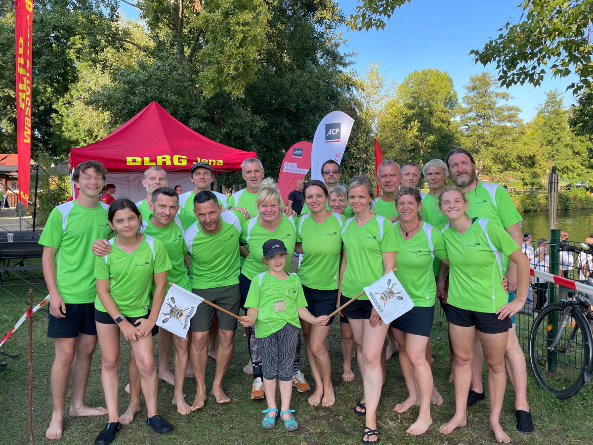 »Wir versuchen schon seit 3 Jahren »einstellig« zu werden, so Teamkapitän und UniverSaale-Pädagoge Jan Witzlack. »Unser Trainer und Steuermann Uwe vom JKRV hatte auch schon in den Vorjahren, in denen wir nicht ganz so gut abgeschnitten hatten, meist nur Lobesworte zu unserer Trainingsleistung, weshalb meine Erwartungen nicht so hoch waren. Dass es dann sogar zum 6. Platz gereicht hat, fühlt sich um so besser an. Ich freue mich für das Team und den Verein. Wir tummeln uns damit ganz weit vorn in der Jenaer Firmenwelt und werden wahrgenommen. Es macht aber auch Druck das nächste Jahr. Mit 4 bis 5 Trainings wird niemand zum Drachenboot-Athleten. Wenn wir die Platzierung halten oder sogar noch schneller werden wollen, wird viel Feintuning im Boot nötig sein. Dazu braucht es eine hohe Kontinuität im Team und das wird unsere Strategie bleiben.«