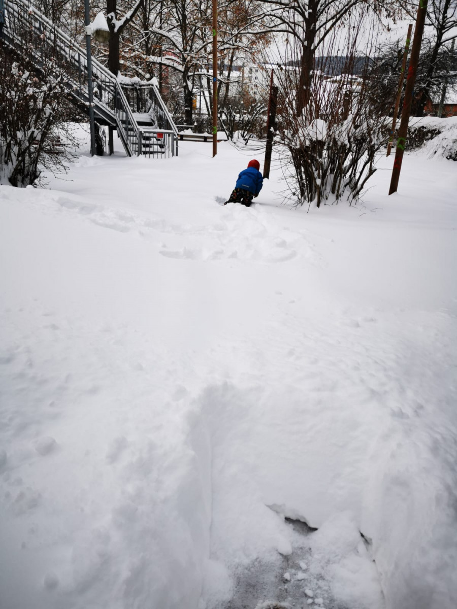 5 Kinder haben den Weg in den Kindergarten aufgenommen und so richtig im Garten getobt. Für die jüngeren unter ihnen war es schwer, überhaupt ein paar Schritte durch den tiefen Schnee zu laufen.