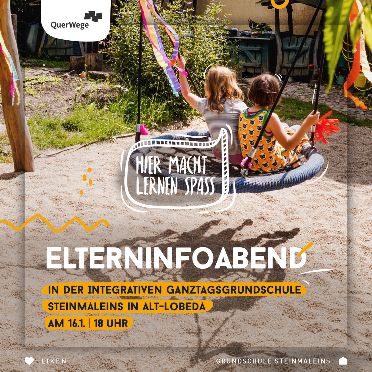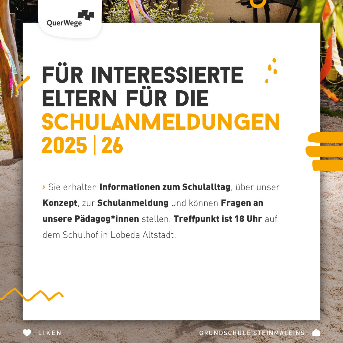 Elternabend mit Schulbesichtigung und Informationsveranstaltung für interessierte Eltern für Schulanmeldungen 2025/26 am Standort Lobeda (Susanne-Bohl-Straße 2), Die Eltern erhalten Informationen zum Schulalltag, über unser Konzept, zur Schulanmeldung und können den Pädagog*innen Fragen stellen. Treffpunkt ist 18.00 Uhr auf dem Schulhof in Lobeda Altstadt.