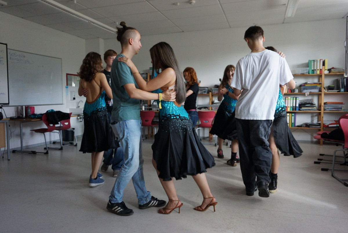 Aus dem Stammgruppenraum XIII dringt beschwingte Musik. Mit taktkräftiger Unterstützung von unserem Schüler Pawel und dem Tanzlehrer Olaf Hartwig wird hier Salsa geübt. Am Freitag sind drei 15minütigen Aufführungen zu erwarten. Auch unsere Gäste dürfen sich beim freien Salsa–Tanzen dazugesellen. (le)