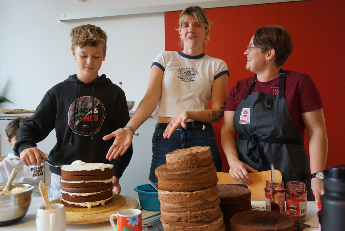 Hier schwingt man die Kochlöffel, in der Küche der UniverSaale. Jeden Tag backen die Teilnehmer*innen unendlich viele Kuchen, mit dem großen Ziel, dass am Ende der Jentower ensteht. Dieser wird ein Schokokuchen sein, in die Zwischenschichten kommt Kirschmarmelade und außen dran Buttercreme. Hoffentlich wird es am Ende wirklich der Jentower und nicht etwa der schiefe Turm von Pisa. ;) (an,lo)