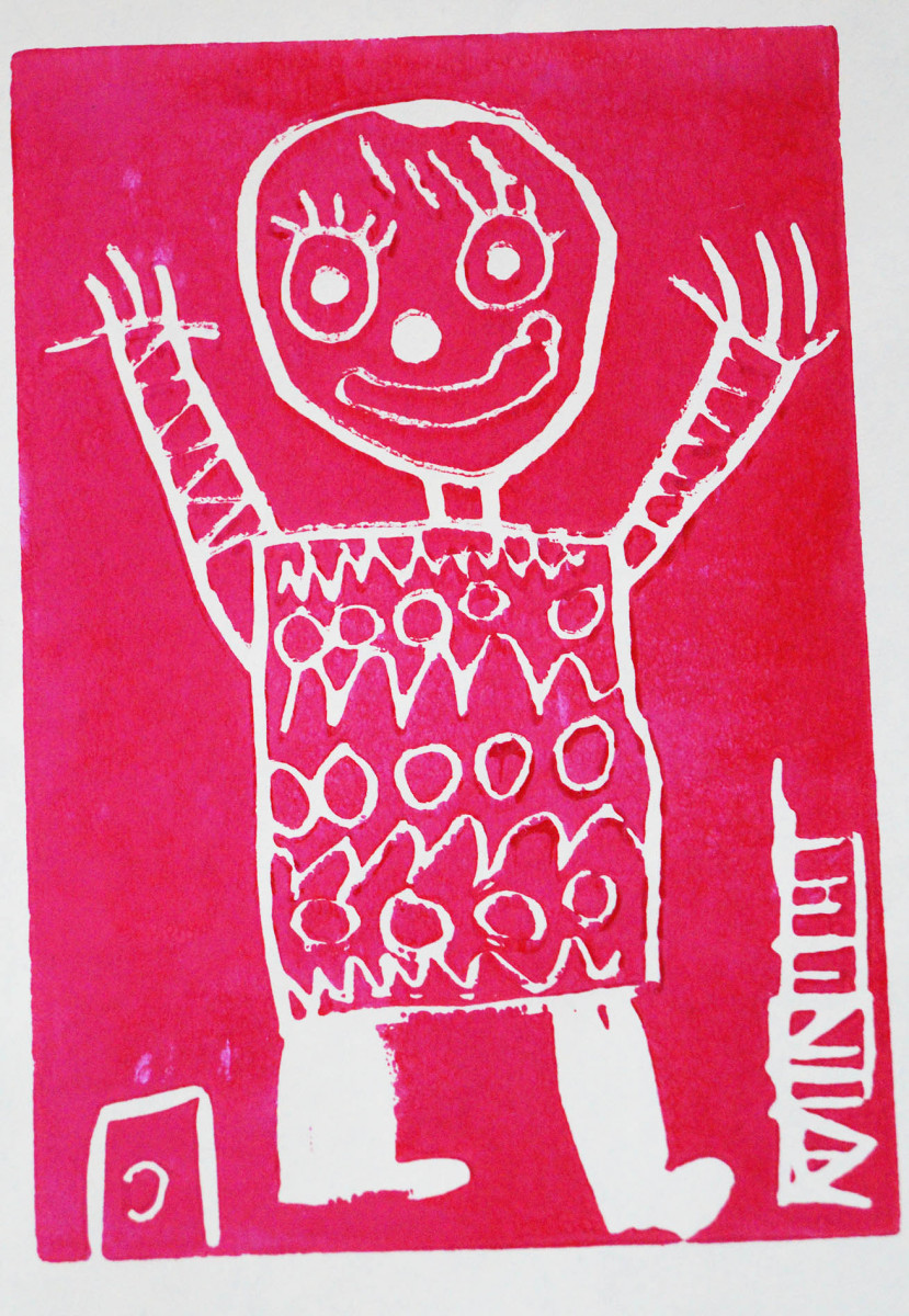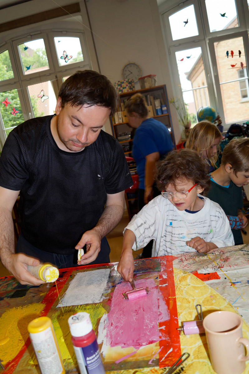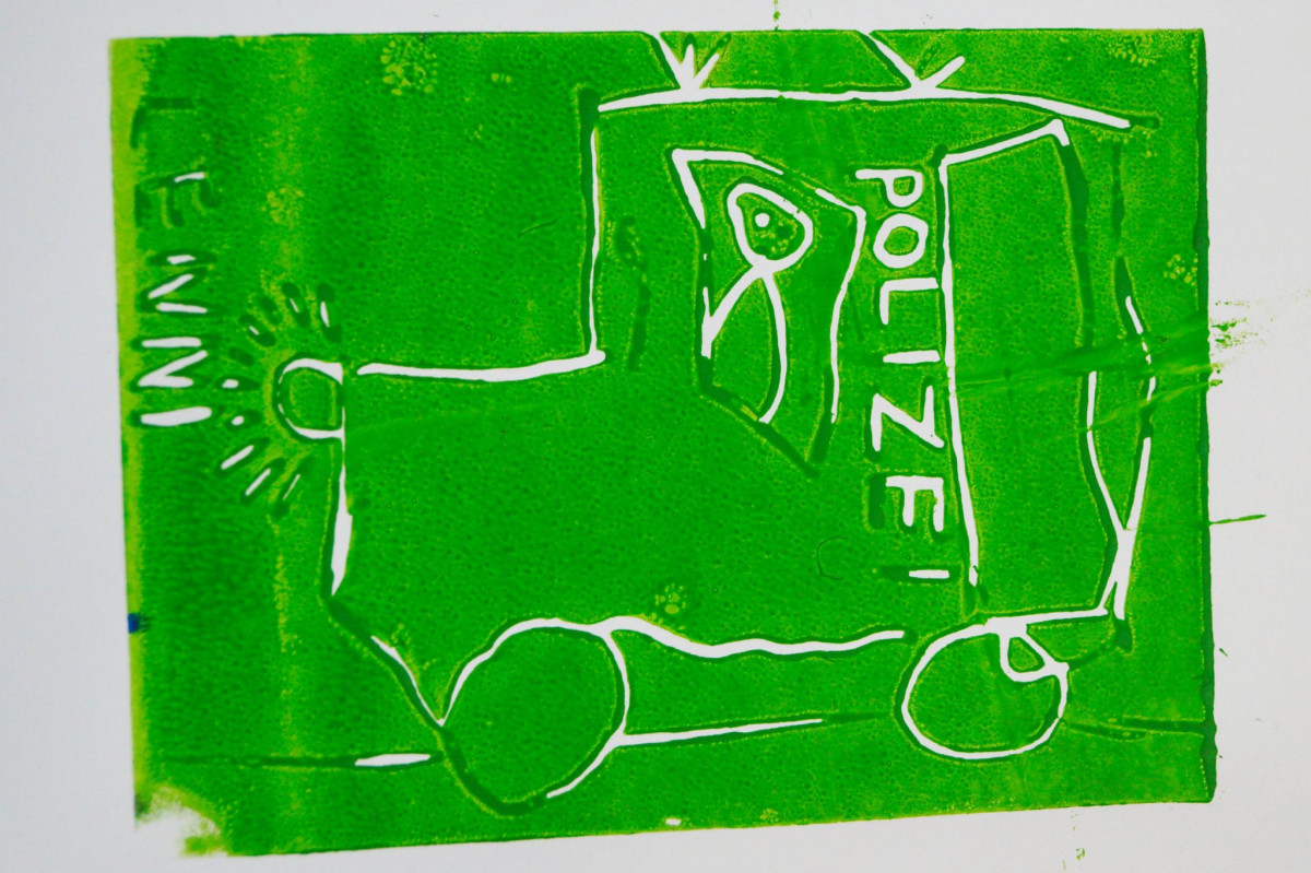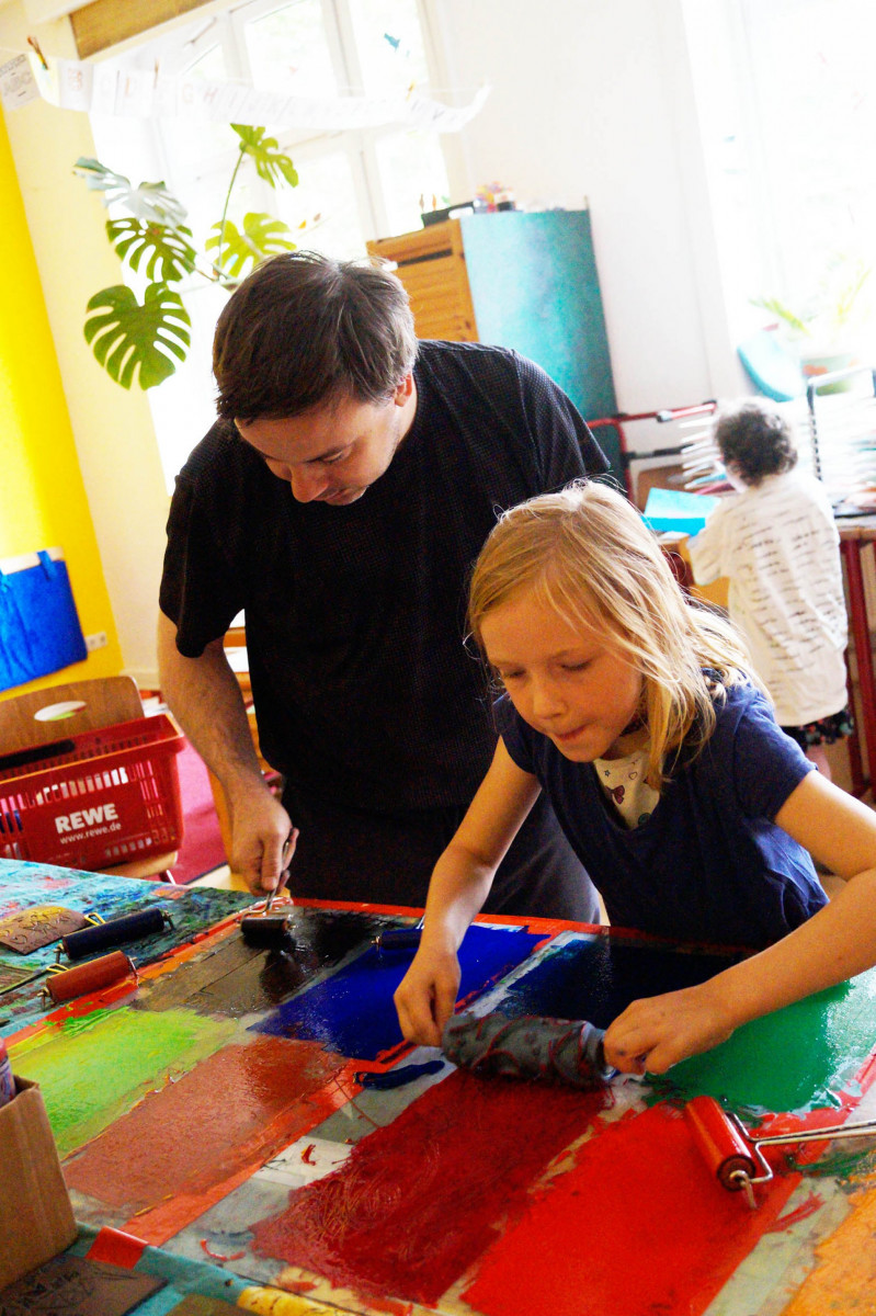 Unter Anleitung von Franziska Pochert und Andreas Dürer von Buchkinder Jena lernten die Kinder etwas über den Linoldruck. Der Linolschnitt ist eine graphische Technik. Es wird in eine Linoleumplatte mit speziellem Werkzeug ein Negativmuster geschnitten. Das fertige Negativmuster wird mit Farbe überwalzt und auf Papier gedruckt.