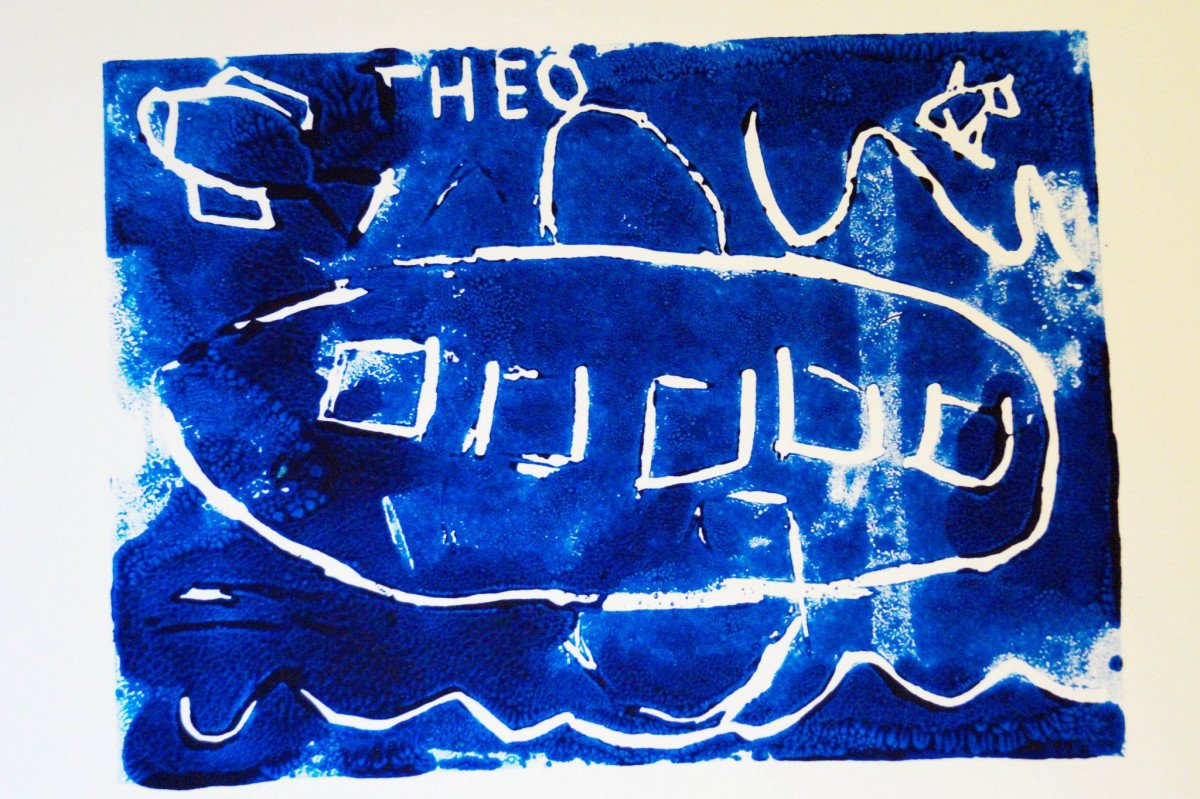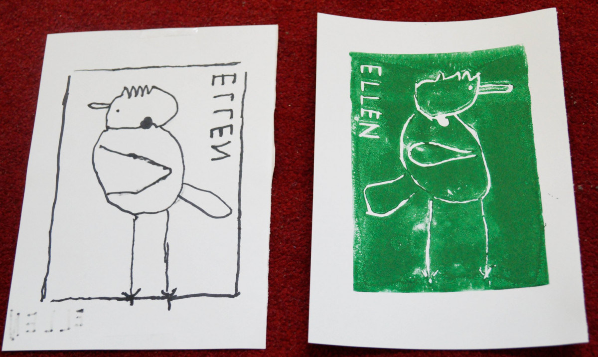 Dazu war es notwendig zu verstehen, wie eine Zeichnung im Negativ aufs Papier zu bringen ist, um sie drucken zu können. Das bedeutet die Kinder mussten z.B. Buchstaben spiegelverkehrt aufs Papier bringen. Wie das geht konnten ihnen Andreas und Franziska gut erklären.