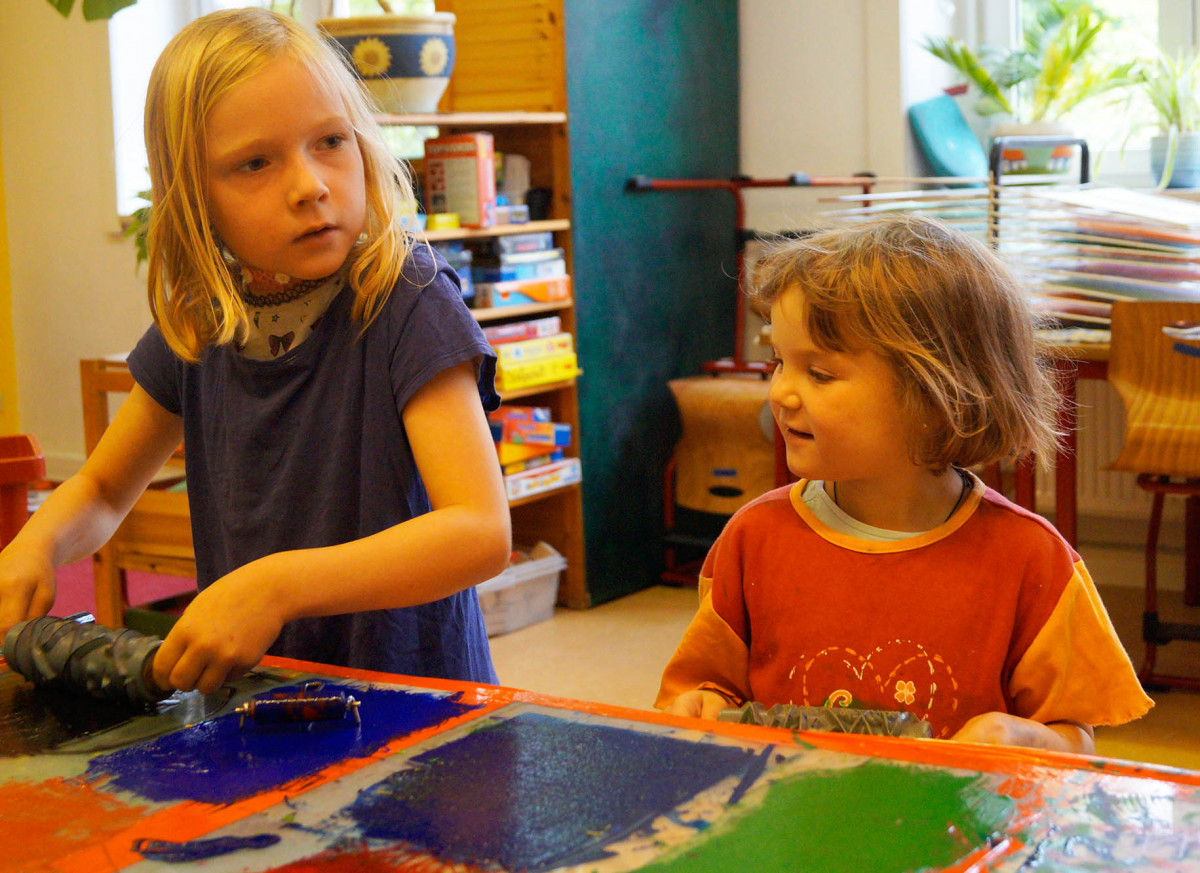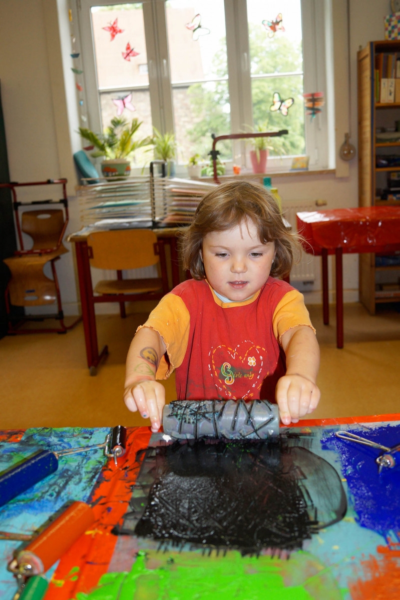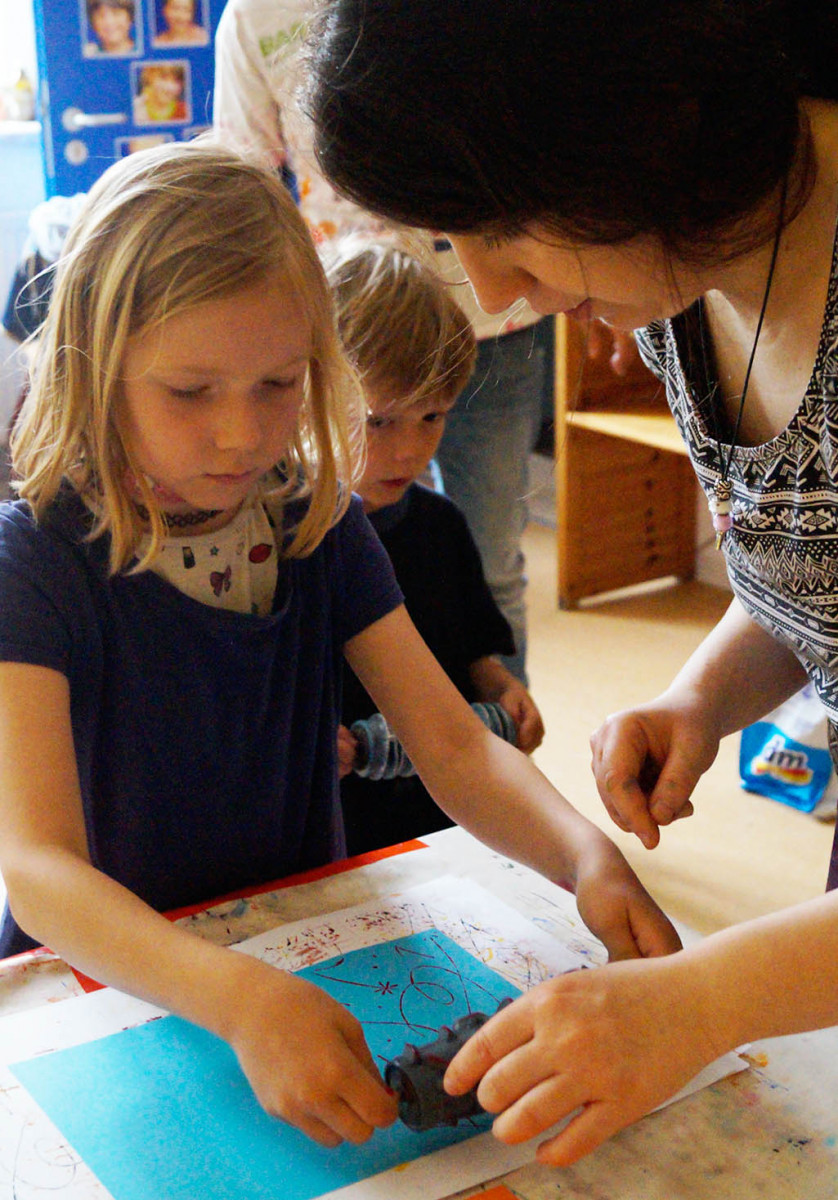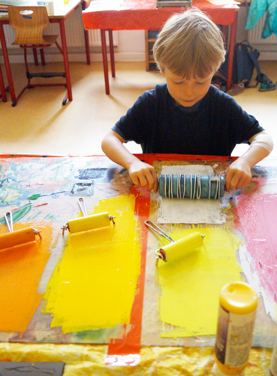 Ihre fantasievollen Motive schnitten sie in die Platten. Anschließend wurde diese mit Farbe bestrichen. So entstanden wundervolle Drucke. Ebenso wurden mit Motivrollen tolle Karten in zwei Ebenen hergestellt. Zwischendurch mussten die Rollen ständig abgewaschen werden, was den Kindern riesige Freude bereitete.