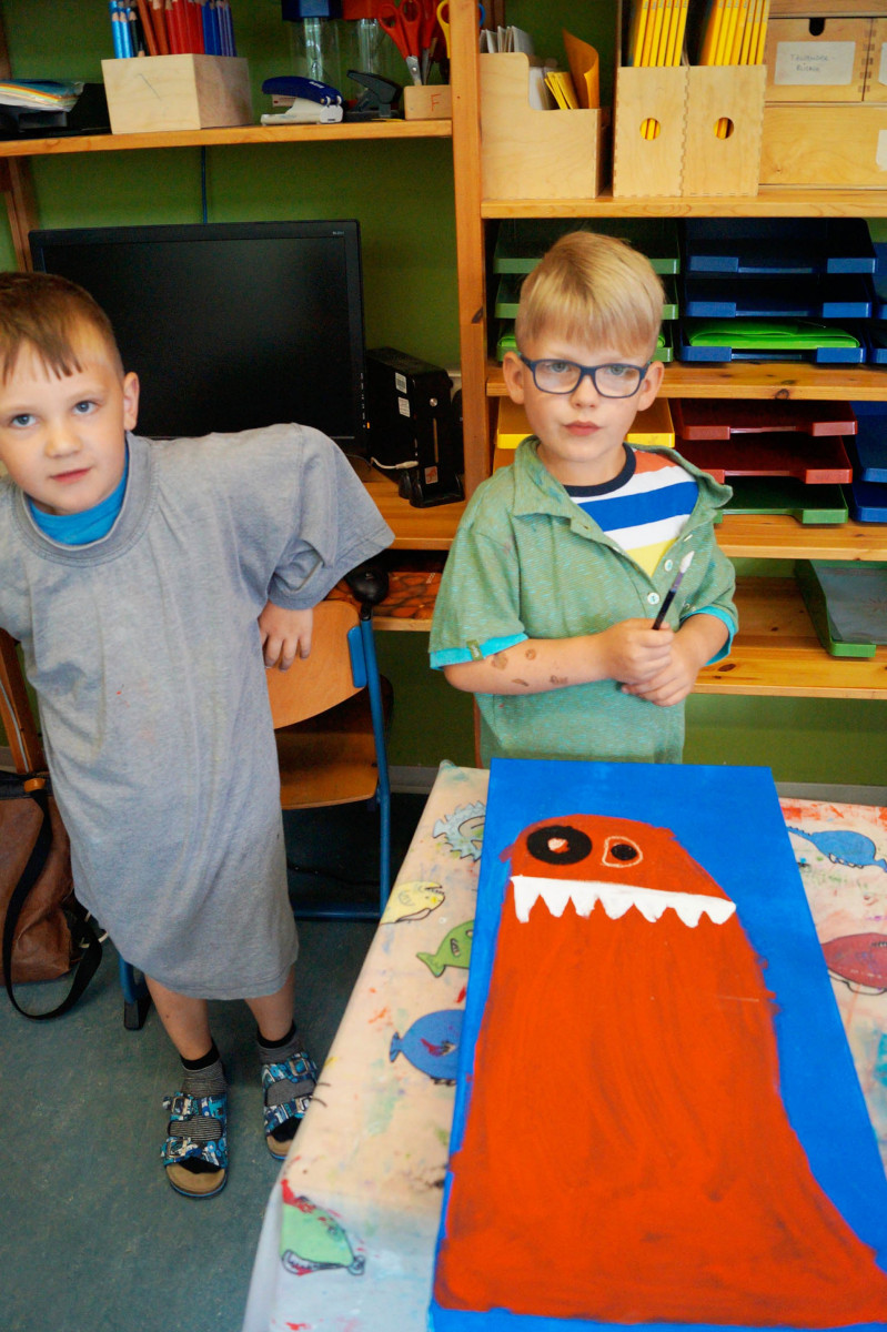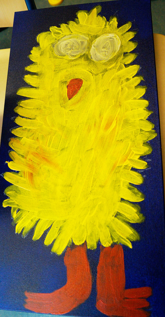Es entstanden beeindruckende Monster – böse Monster natürlich mit funkelnden Augen. Sowie fantasievolle lustige Tiere in bunten Farben. Zwei bunte schräge Vögel fanden ebenfalls eine Leinwand. Es war ein Prozess voller Austausch und ausprobieren bis die Motive Gestalt annahmen. Umso schöner und farbintensiver verzaubern sie nun ihre Betrachter.