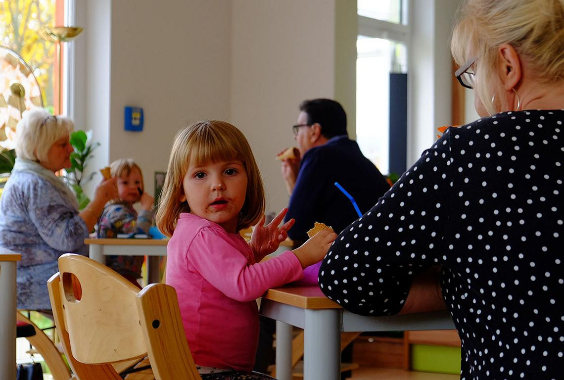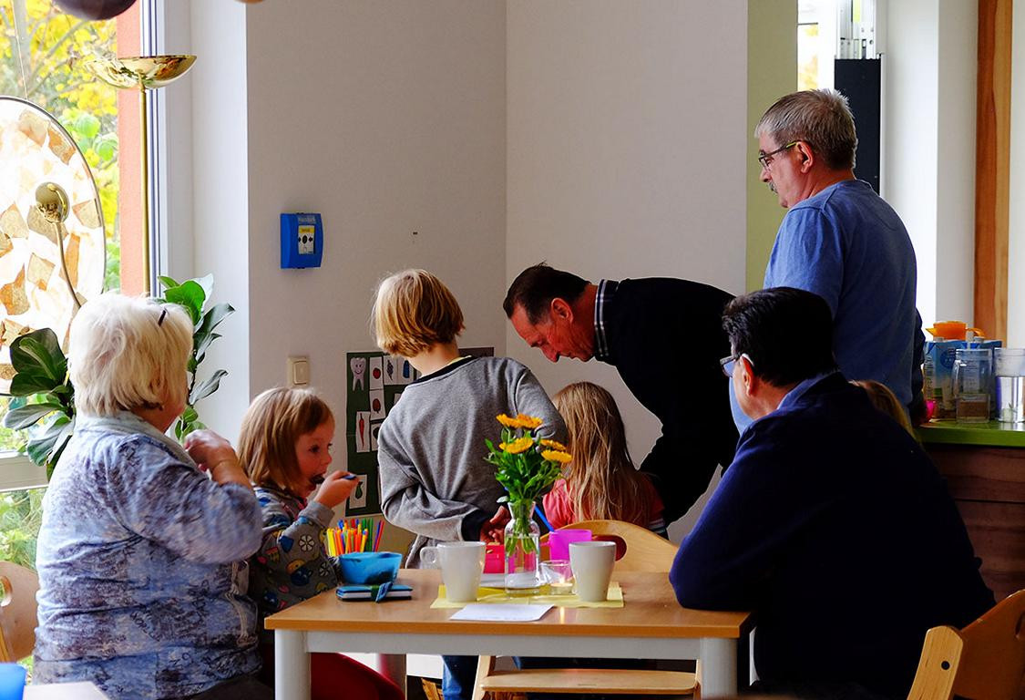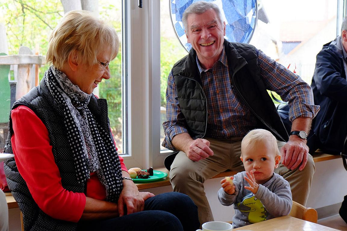 Am 20. Oktober fand unser diesjähriger Oma & Opa-Tag statt. Zahlreiche Großeltern waren 15:30 Uhr gekommen, um sich die Kita anzuschauen, sich von ihren Enkeln die Räume und den Garten zeigen zu lassen und natürlich unseren Meerschweinchen “Hallo” zu sagen. Es gab Kaffee, leckeren Kuchen und gesunde Snacks in unserem Restaurant, im zum “Kino” umfunktionierten Bewegungsraum lief Shaun das Schaf und die Kinder führten begeistert die tollen Spielsachen ihren Omas und Opas vor. Wer wollte konnte sich im Kartoffeldruck ausprobieren oder gemeinsam in den Portfolios blättern. Für unsere Kinder war es ein sehr aufregender und schöner Nachmittag und auch die Gäste hatten ihren Spaß. Vielen Dank an alle Helfer für diesen schönen Nachmittag!