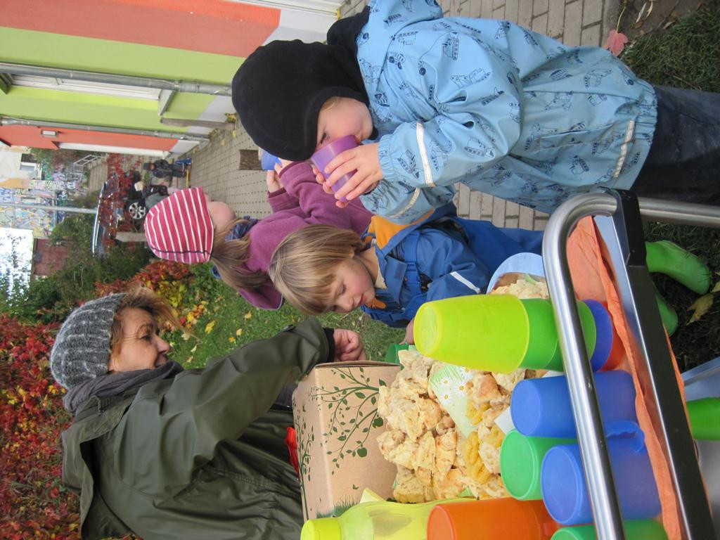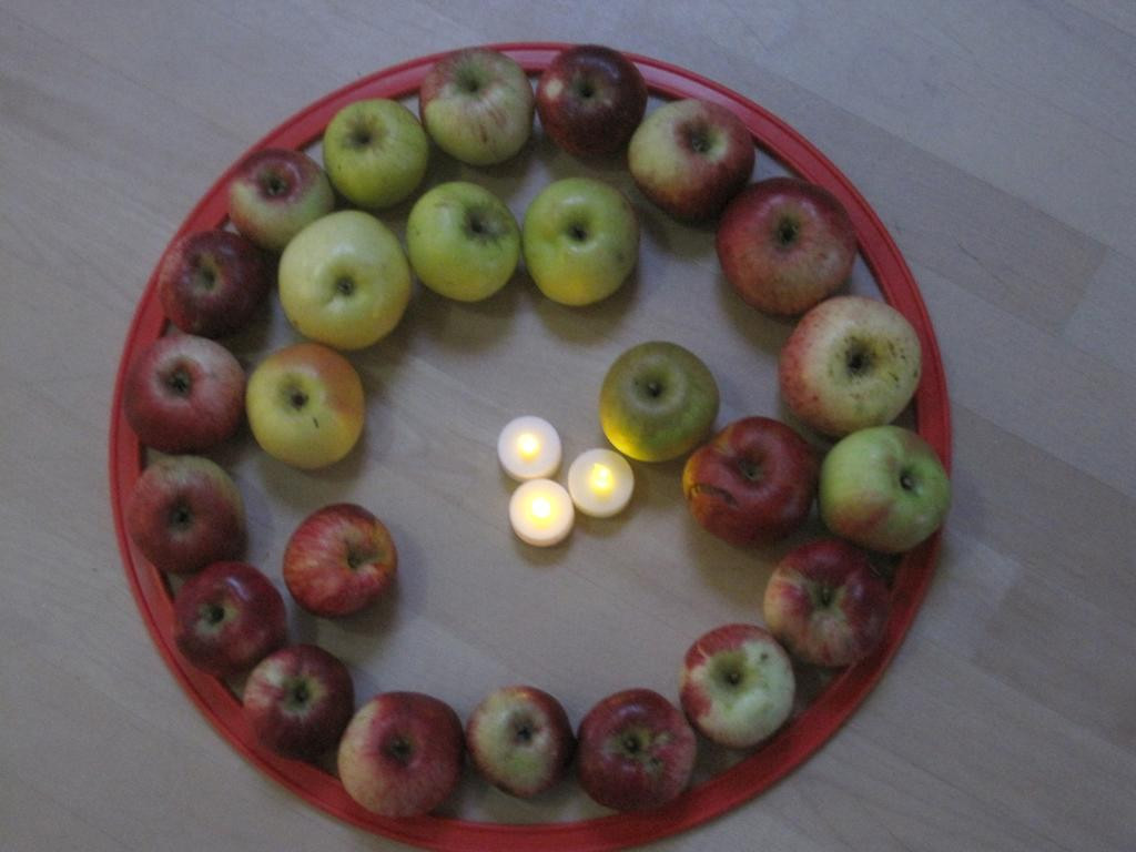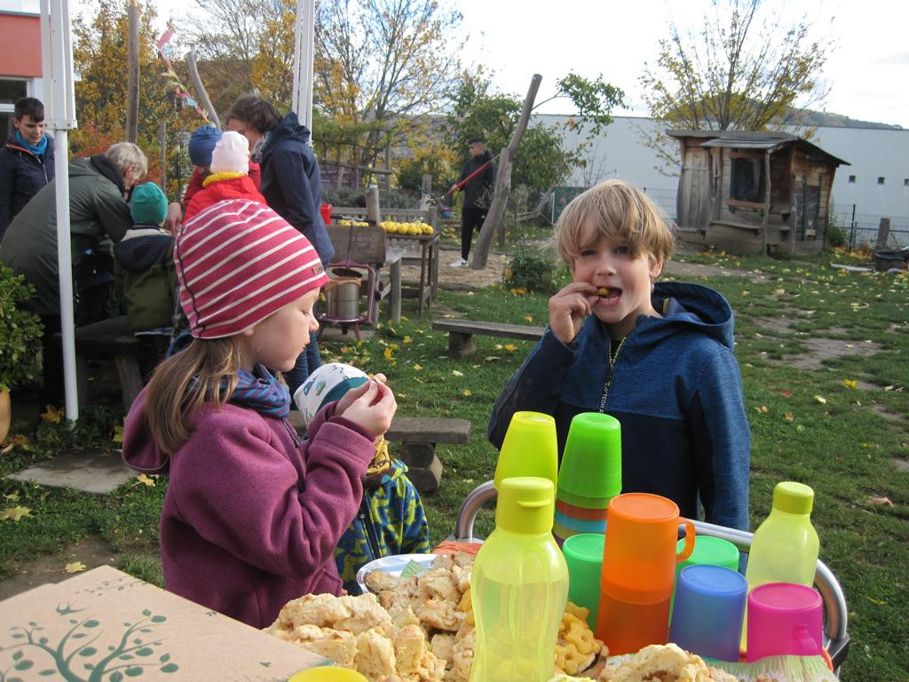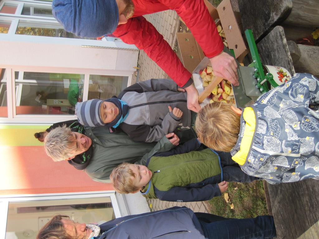 In diesem Jahr gab es eine sehr große Apfelernte, so brachten viele Eltern mit ihren Kindern die Früchte in die Kita. Fleißig haben wir alle Äpfel geschnitten und daraus kleine Apfelküchlein gebacken. Wir stellten mit einer Saftpresse leckeren Apfelsaft her, aber auch zu Apfelmus und Gelee verarbeiteten wir die roten und gelben Früchte. Zum Höhepunkt gab es natürlich im Garten ein tolles Apfelfest.