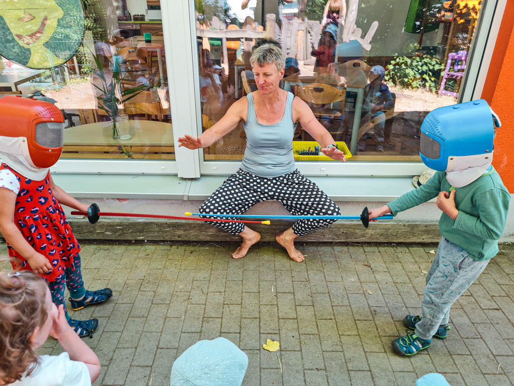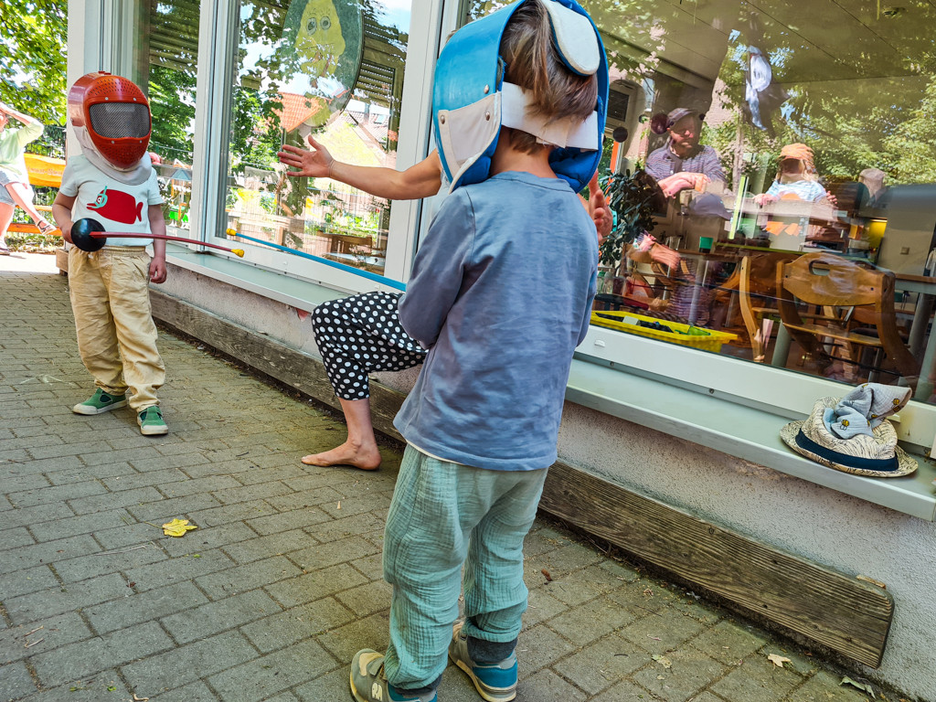 Am 14. und 15.6. feierten wir an zwei Tagen Geburtstag und luden Wegbleiter*innen aus dem Verein, Eltern und Ehemalige ein, um mit uns anzustoßen. Am Mittwoch besuchten uns die Kinder unserer anderen beiden Kitas Schwabenhaus und BiLLY. Es gab eine Show unserer Erzieher*innen und gemeinsam wurde experimentiert, gespielt, die Rollrutsche ausgiebig getestet, am Büffet gefuttert und sogar mit Degen am Piratenschiff gekämpft.