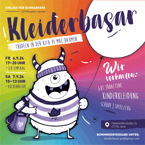 Bald ist es wieder soweit! Der Elternberat der Kita Pi mal Daumen lädt herzlich zum jährlichen Herbst-Kleiderbasar an zwei Tagen ein. Wer auf der Suche nach gut erhaltener Kinderkleidung in den Größen 50 bis 140, Schuhen und Spielzeug ist, sollte unbedingt vorbeikommen und mit Sekt (am Freitag) bzw. Kaffee und Kuchen (am Samstag) durch das reichhaltige Angebot stöbern. Schwangere haben 30 min vorher Eintritt – für ein entspannteres Einkaufen :)
