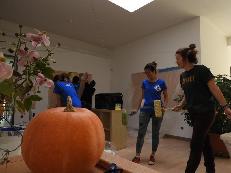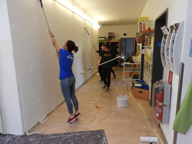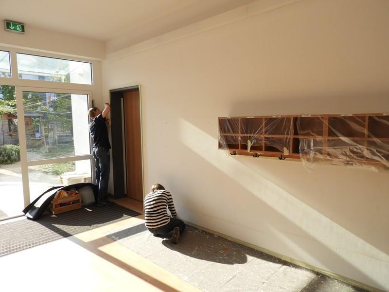 Am Samstag den 15.09. 2018 hieß es bei uns wieder: Freiwillige vor! Unsere Kita nahm dieses Jahr wieder an dem Freiwilligentag der Bürgerstiftung teil. Geplant waren Malerarbeiten im Foyer, im Kleinkindbereich und im Flur. Nun hieß es abschrauben, abkleben und Folie auslegen. Und dank der zahlreichen Beteiligung von unglaublichen 16 Personen(!!), war dies auch im Nu erledigt. Nach getaner Arbeit ließen wir es uns noch bei leckerer Pizza gut gehen und räumten im Anschluss die Garderoben-Bänke wieder an ihren Platz. Wir danken den freiwilligen Helfern für die tatkräftige Unterstützung – unsere Kita ist nun wieder ein Stückchen schöner!