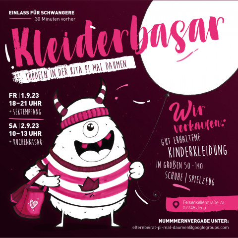 Bald ist es wieder soweit! Der Elternberat der Kita Pi mal Daumen lädt herzlich ein zum jährlichen Herbst-Kleiderbasar an zwei Tagen ein. Wer auf der Suche nach gut erhaltener Kinderkleidung in den Größen 50 bis 140, Schuhen und Spielzeug ist, sollte unbedingt vorbeikommen und mit Sekt bzw. Kaffee und Kuchen durch das reichhaltige Angebot stöbern. Schwangere haben 30 min vorher Eintritt, für ein entspannteres Einkaufen :)