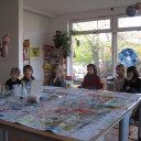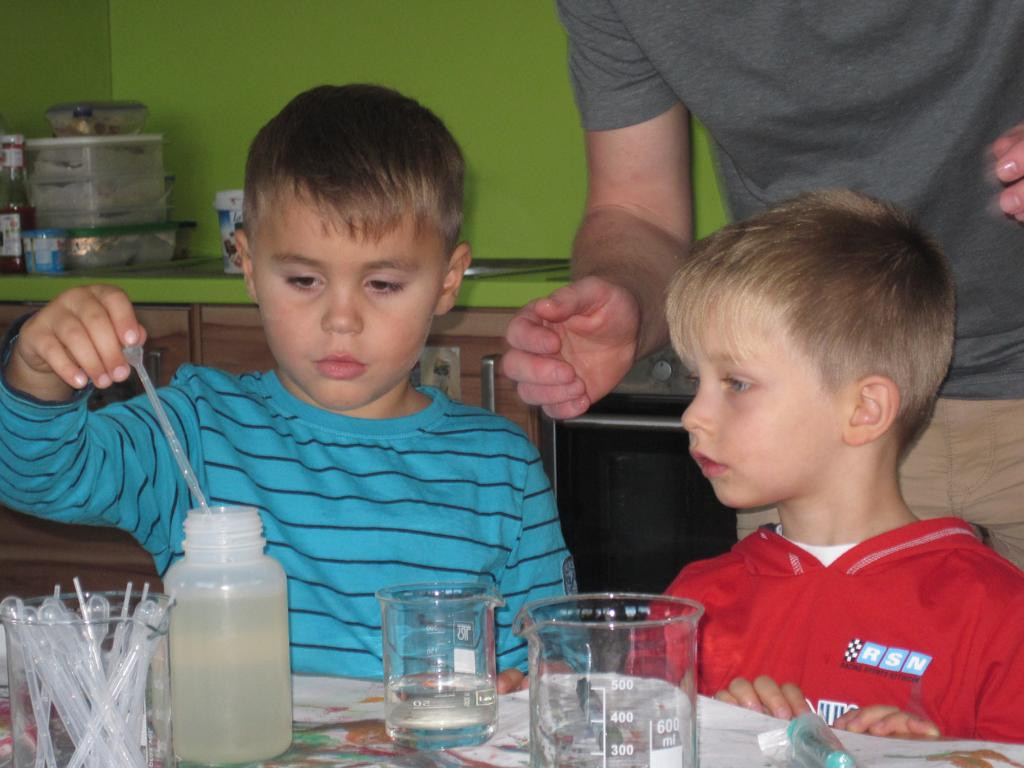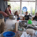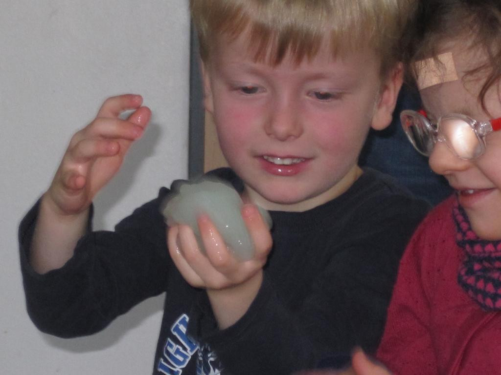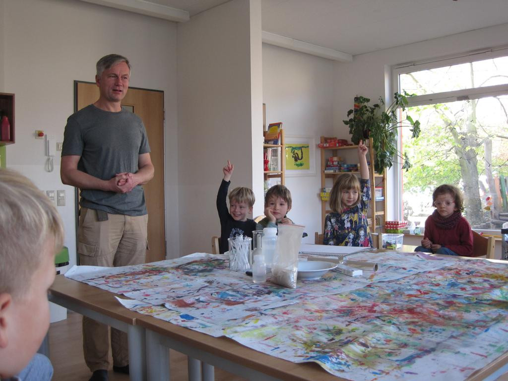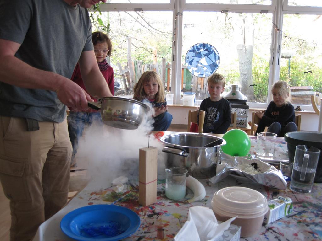 Ein Versuchstag mit Materialien, die es sonst nur im Labor gibt, erlebten wir dank Theos Papa. Er brachte uns u.a. eiskalten flüssigen Stickstoff und Materialien mit, bei denen wir das Verknoten der Moleküle beobachten konnten. Unser Restaurant verwandelte sich in eine richtige, manchmal stinkende, „Hexenküche“. Alle Kinder konnten selbst ausprobieren, riechen, anfassen und staunen. Aber der Höhepunkt war selbst hergestelltes Eis aus Stickstoff, Sahne und Beeren und das durfte natürlich gegessen werden.