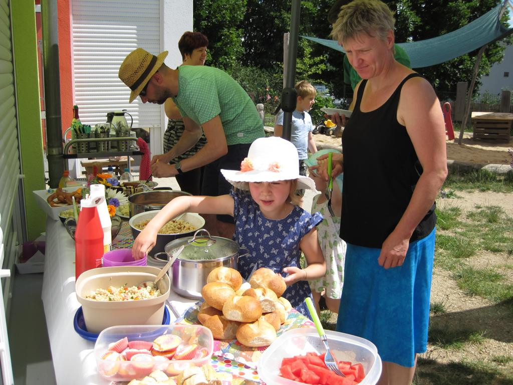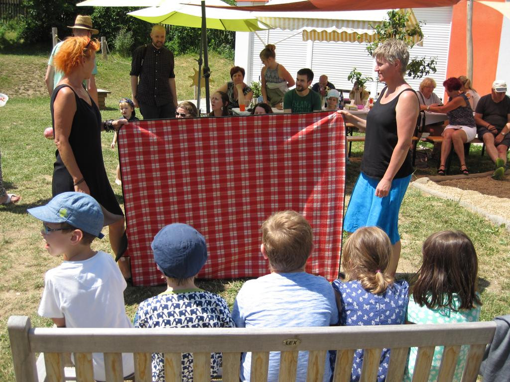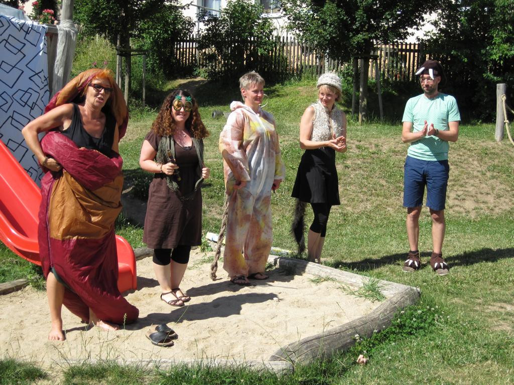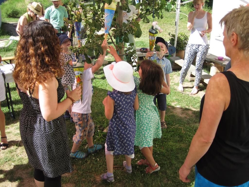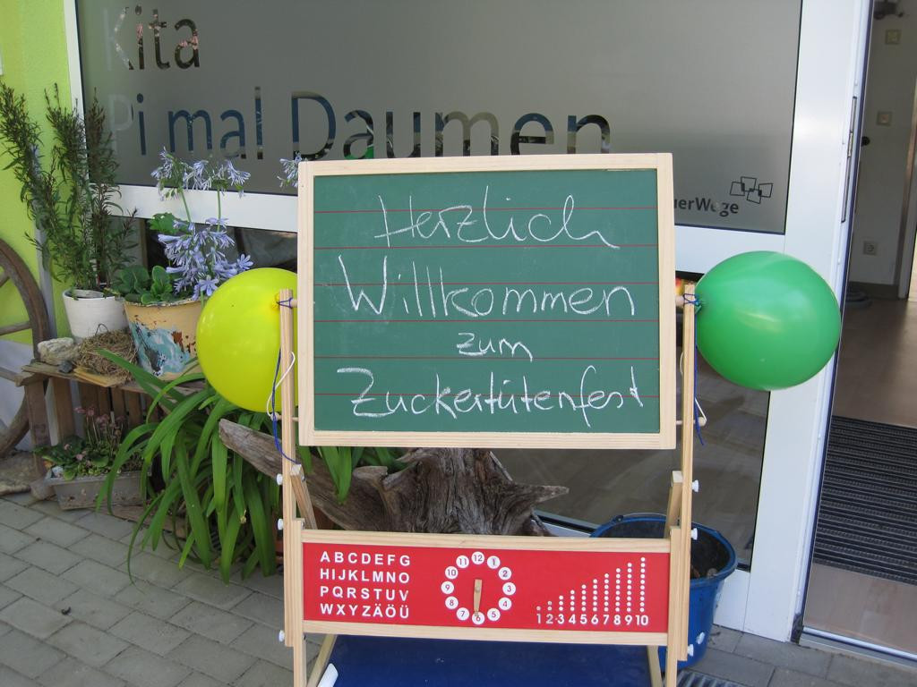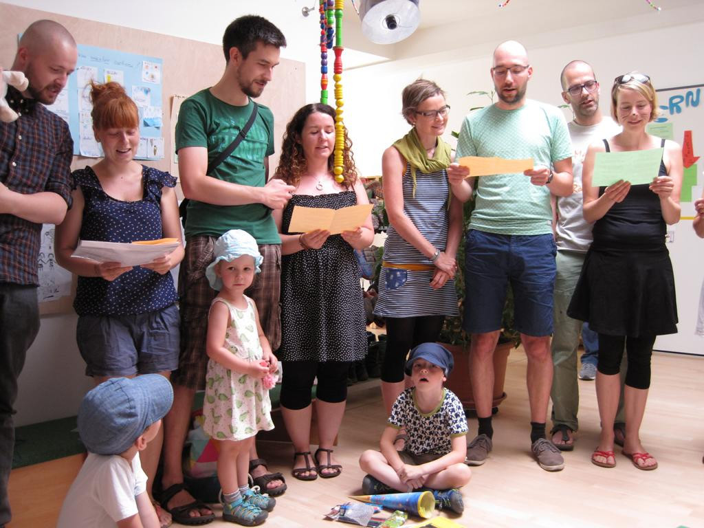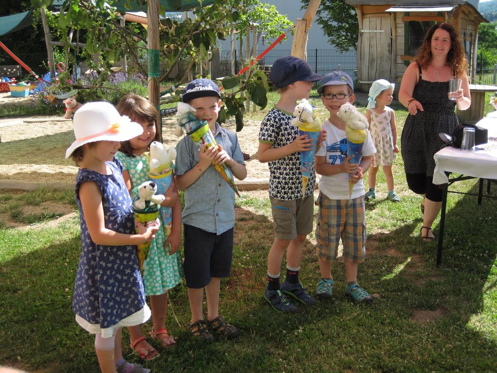 Am vergangenen Samstag trafen sich 10.00 Uhr bei Sonnenschein alle Familien der Wackelzähne zum Zuckertütenfest in unserer Kita. Zum Auftakt spielten Eltern und Erzieherinnen gemeinsam das Theaterstück „Der Grüffelo“, allerdings fehlerhaft – aber sofort entdeckten die Kinder die falschen Dinge und schlugen die Klangschale an und korrigierten die Erwachsenen! Nach dem lustigen Theaterstück übergaben die Erzieherinnen den Kindern ihre Malmappen und dicken Portfoliohefter. Auch die Eltern überreichten ein Dankeschön an die Pädagoginnen und bedankten sich mit einem extra für die Bezugserzieherinnen umgedichteten Lied. An einem leckeren Büffet stärkten sich alle Kinder und Erwachsenen, bevor es zu einer lustigen Spielrunde überging.