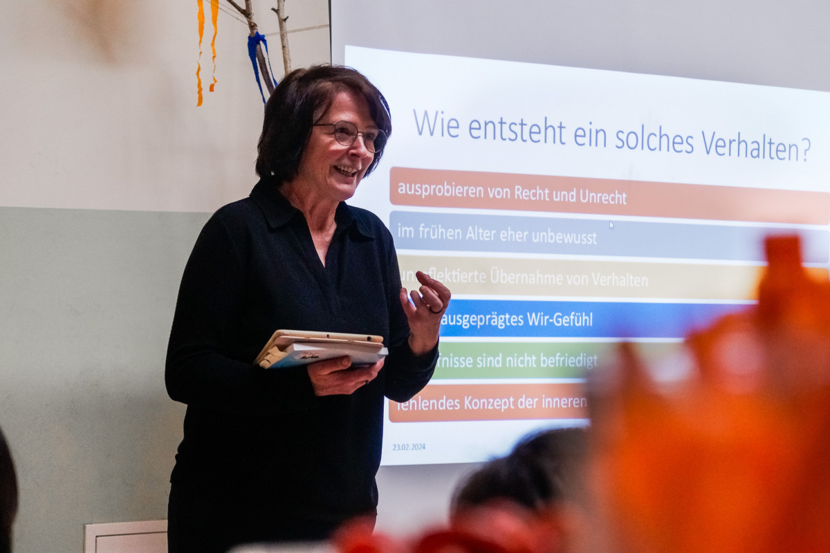 Aber was ist nun ausgrenzendes Verhalten in Abgrenzung zum Ausprobieren in der kindlichen Entwicklung? Und wie entsteht es eigentlich? Auch dazu gaben wir in der Veranstaltung Impulse: Eine erfolgversprechende Methode ist u.a. das aktive Zuhören. Das wird in unseren Kitas immer wieder geübt, denn es ist wichtig, dass wir genau beobachten, verstehen und adäquat antworten. So erfahren wir, wie sich das Kind fühlt, was es uns sagen will und können zum Wohl des Kindes handeln.