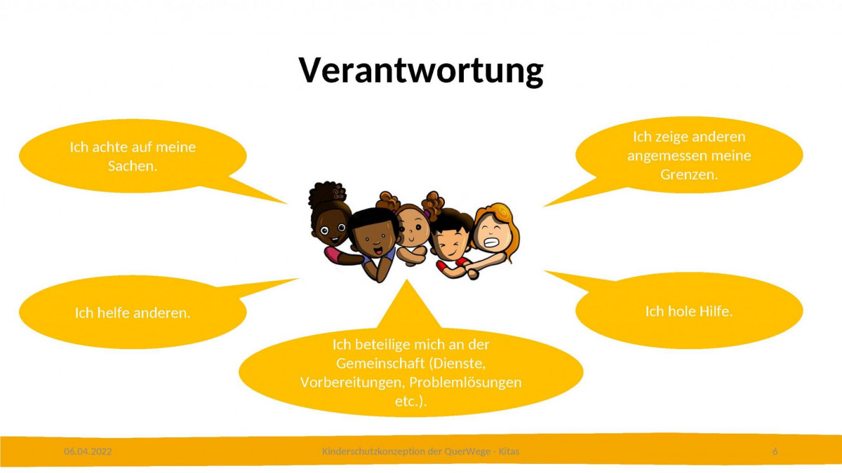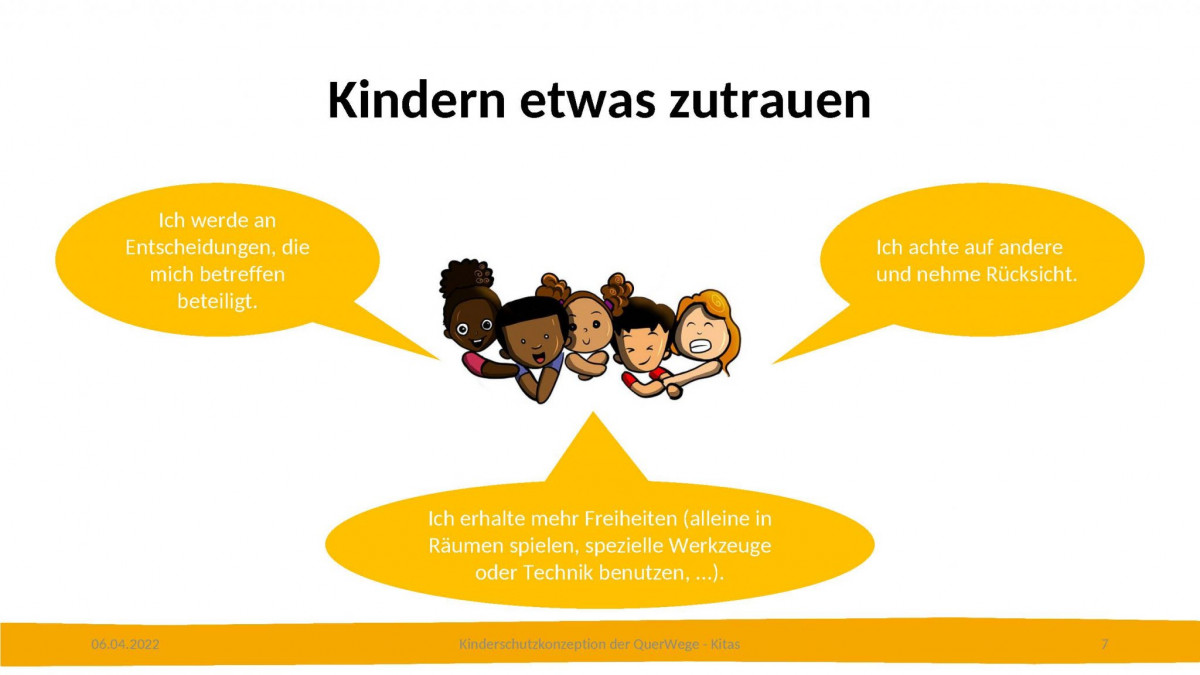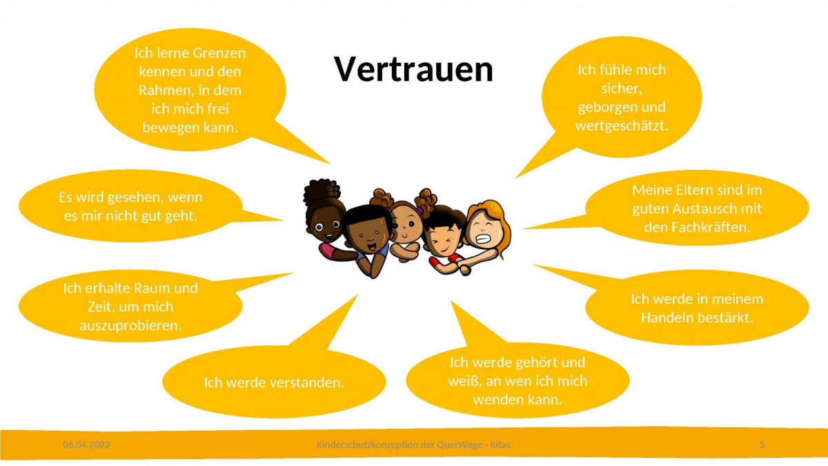Im April fand ein gemeinsamer Elternabend aller drei QuerWege Kitas statt, mit dem Ziel das gemeinsam überarbeitete Kinderschutzkonzept für unsere Einrichtungen vorzustellen. Die Beteiligung an der virtuellen Veranstaltung war groß, rund 40 Eltern waren interessiert zu erfahren, wie Partizipation und Selbstwirksamkeit zum Kinderschutz beitragen. Das zentrale Anliegen der pädagogischen Arbeit in unseren Kitas ist es, Kinder stark zu machen, sie zu befähigen, selbst auf ihre Grenzen zu achten, ihre Bedürfnisse wahrzunehmen und dafür einzustehen. Diese Stärke ist effektive Prävention vor Missbrauch körperlicher oder psychischer Art.