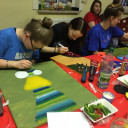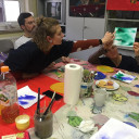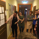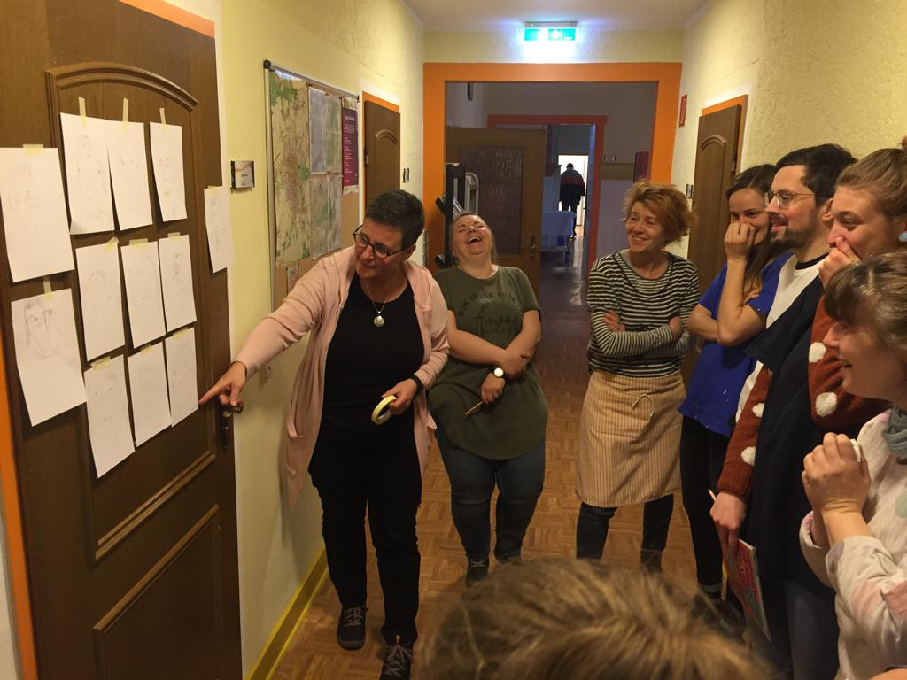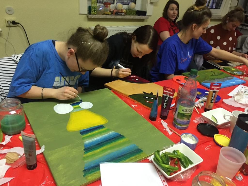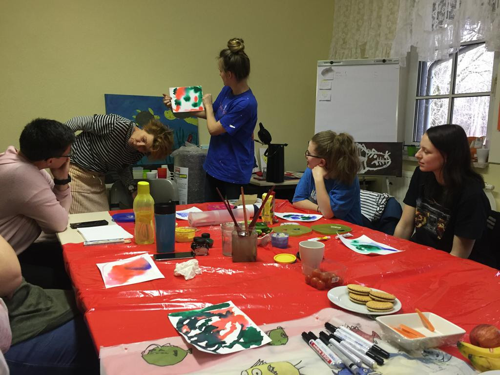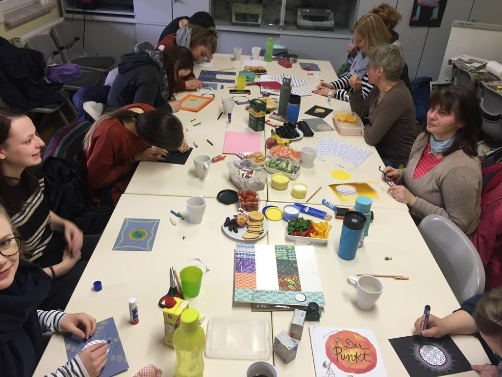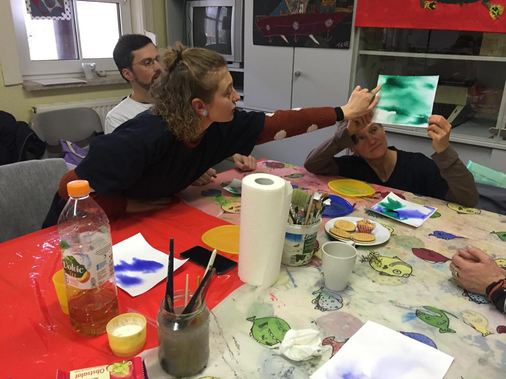 Am 6. und 7. März 2020 trafen sich die Pädagog*innen der Kita Pi mal Daumen in der Jugendherberge Ettersberg bei Weimar. Ziel dieser Weiterbildung war es, sich einerseits in Kunsttechniken einzuarbeiten, neue Impulse zu bekommen für verschiedene Kreative Aufgaben. Andererseits sollte das kommende Projekt geplant und dessen Ziele und Umsetzung ausgearbeitet werden. Der Freitag stand ganz im Zeichen der künstlerischen Tätigkeit selbst. So wurden Techniken wie Portrait (hier ein Blind-Portrait eines Kollegen) oder Tusche-Bilder getestet. Den Anfang machte die künstlerische Auseinandersetzung mit dem „Punkt“. Schon hier zeigten sich verschiedenste Sichtweisen und Möglichkeiten auf ein einfaches Thema. Den zeitlich größten Teil nahm die Arbeit an einem großformatigen Bild mit Acrylfarben ein. Hierbei wurde nicht nur flächig, sondern auch im Relief gearbeitet. Motive nach Vorlagen oder frei ausgewählt. Der wichtigste Punkt aber war, sich wieder bewusst zu machen, welche Techniken mit welcher Altersgruppe möglich sind und welche Möglichkeiten in diesem Projekt – das bis zum Sommer gehen soll – stecken. Hierzu gab es fachliche Unterstützung von der Pädagogin Simone Raths aus der Kita „Schwabenhaus“, bei der wir uns auch auf diesem Weg für die vielen Tipps und Impulse bedanken wollen. Es ist eben nicht nur Malen oder gestalten, es steckt noch viel mehr darin.