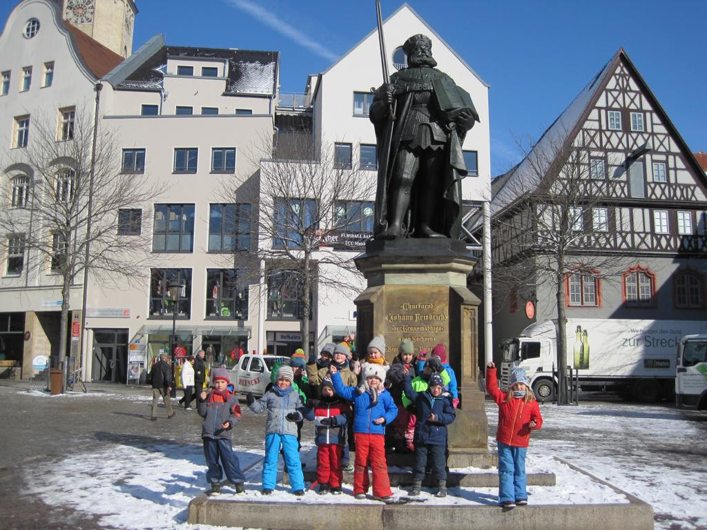 Seit Januar beschäftigen wir uns gemeinsam in einem Projekt mit unserer Heimatstadt Jena. Dazu haben wir bereits viel entdeckt und kennengelernt, wie die sieben Wunder von Jena, die Saale und den Uni-Turm. Verschiedene Herangehensweisen über Lieder, Geschichten, Ausflüge brachten uns die einzelnen Sehenswürdigkeiten näher. Wir haben ein Diorama gestaltet, Gebäude nachgebaut und vieles mehr.