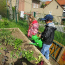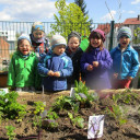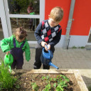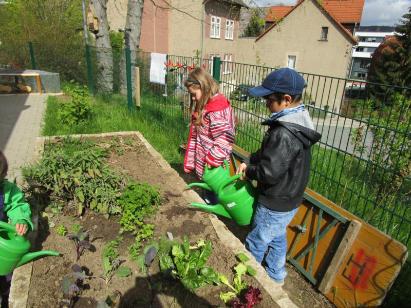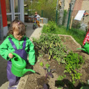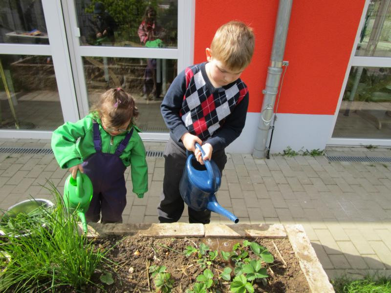 Jeden Freitag kommt eine kleine Gruppe von Kindern zusammen um gemeinsam „gärtnerisch“ tätig zu werden. Das Hochbeet steht dabei im Mittelpunkt der Gartenarbeit. In kleinen Aktionen bei denen sie selbst umgraben und Löcher budeln, Zwiebeln stecken und säen, lernen sie Grundlegendes über das Wachsen und Pflegen von Gemüsepflanzen. So haben wir in diesem Jahr mit Kohlrabi, Salat, Tomaten, Mangold, Radieschen, Möhren und verschiedenen Kräutern eine bunte Mischung auf dem Beet.