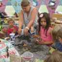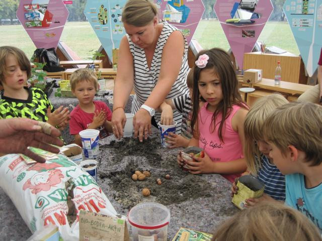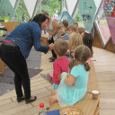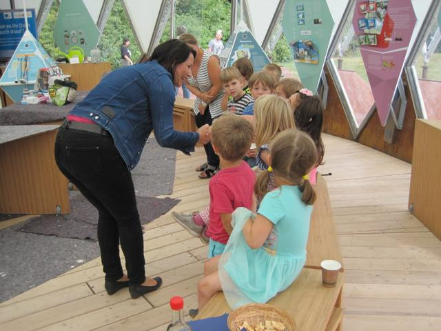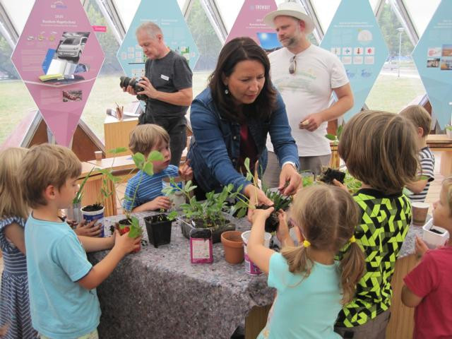 Interessiert beobachteten wir, dass im Paradies etwas Neues aufgebaut wurde. Neugierig stellten unsere Kinder den Erbauern und Begleitern Fragen, was sie da aufbauen und was es sein soll. Die Antwort lautete: Dies wird ein Klima Pavillon. Was ist das? Somit war unser Interesse geweckt. Bis Ende Juli haben 12460 Besucher*innen in den Pavillon reingeschaut. So auch wir! Einmal stellten wir uns Fragen des Klimaschutzes. „Ist doch schön für uns Kinder, wenn es im Sommer wärmer wird!“ Aber was passiert mit den Pflanzen, Bäumen und Tieren? Dies konnten wir sehr gut diskutieren und beantworten. Spielerisch entdeckten wir u.a. unser eigenes Verhalten und welchen Einfluss es auf das Klima haben kann. Ein anderes Mal pflanzten wir mit der Thüringer Umweltministerin Anja Siegesmund und dem Erfurter Gemeinschaftsgärtner Frank Mittelstedt Pflanzen für den Balkon, den Garten zu Hause und für unsere Kita. Nun beobachten wir, wie viel Zeit ein Nussbaum zum Wachsen oder wie viel Zeit eine Erdbeere zum Reifen benötigt. Vor allem unter welchen Bedingungen dies passiert.