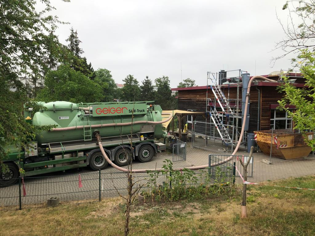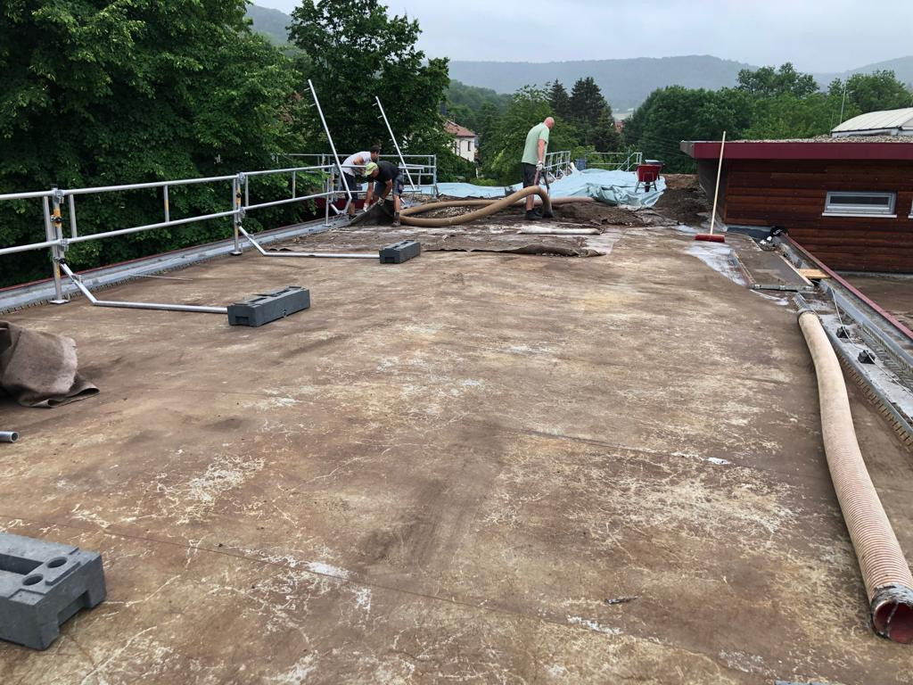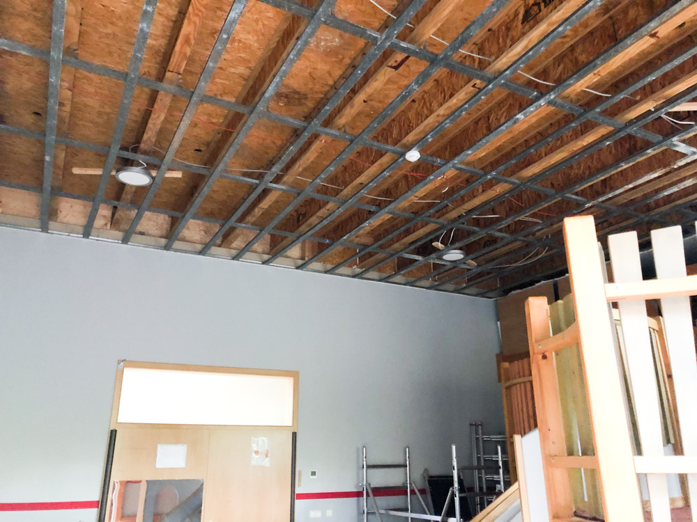 Im Sommer 2022 war es soweit, unser Dach wurde durch die Firma Oeser und Orlet saniert. Eine Baustelle von mehreren Monaten, mit Einschränkungen für uns alle, stand uns ins Haus. In einem ersten Schritt musste unsere komplette Dachbegrünung mit einem Saug-LKW abgetragen werden. Stück für Stück wurde im Anschluss unser Dach erneuert und alles schien nach Plan zu laufen. Als jedoch die Dachdecker über unserem Rollenspielraum, Foyer und Restaurant Hand anlegten, offenbarte sich der gesamte Schaden. Die komplette Dämmung stand über die Jahre vollständig im Wasser und musste ebenfalls komplett erneuert werden. In einem letzten Arbeitsschritt wurde eine neue Dachhaut verlegt, welche uns mindestens die nächsten 20 Jahre vor tropfenden Lampen bewahren sollte. Für uns alle war es eine sehr spannende Zeit, in der wir über mehrere Wochen inmitten einer großen Baustelle leben durften. Nun sind es nur noch wenige Handgriffe bis der Raum wieder genutzt werden kann. Die Decke im Rollenspielraum benötigt in einem letzten Arbeitsschritt eine neue Verkleidung.